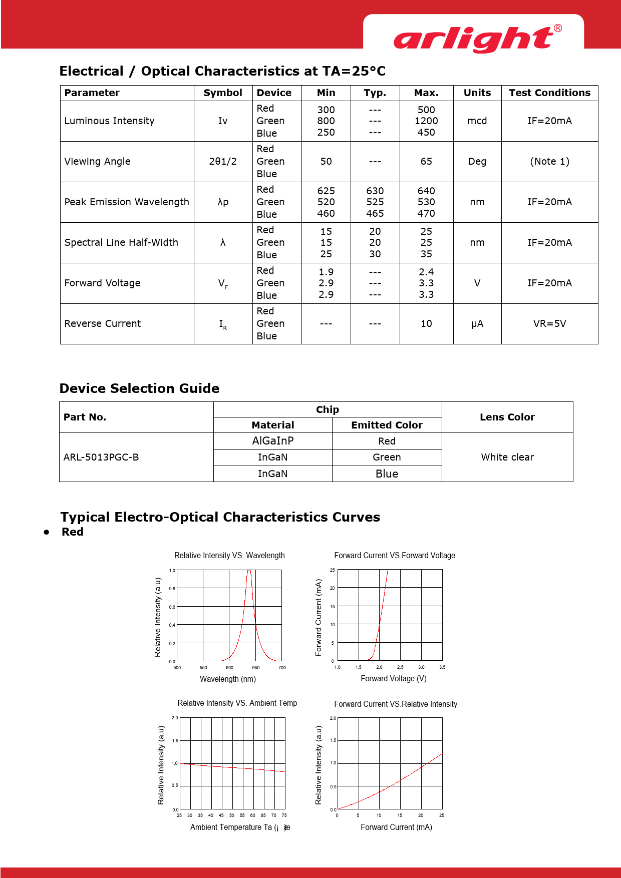 Electrical / Optical Characteristics at TA=25°CParameterSymbolDeviceMinTyp.Max.UnitsTest Conditions Red 300 --- 500 Luminous Intensity Iv Green 800 --- 1200 mcd IF=20mA Blue 250 --- 450 Red Viewing Angle 2θ1/2 Green 50 --- 65 Deg (Note 1) Blue Red 625 630 640 Peak Emission Wavelength λp Green 520 525 530 nm IF=20mA Blue 460 465 470 Red 15 20 25 Spectral Line Half-Width λ Green 15 20 25 nm IF=20mA Blue 25 30 35 Red 1.9 --- 2.4 Forward Voltage V Green 2.9 --- 3.3 V IF=20mA F Blue 2.9 --- 3.3 Red Reverse Current I Green --- --- 10 µA VR=5V R Blue Device Selection GuideChipPart No.Lens ColorMaterialEmitted Color AlGaInP Red ARL-5013PGC-B InGaN Green White clear InGaN Blue Typical Electro-Optical Characteristics Curves• Red Relative Intensity VS. Wavelength Forward Current VS.Forward Voltage 1.0 25 A) 0.8 20 nt (m sity (a.u) 0.6 15 en urre Int 0.4 C 10 ive ard at 0.2 5 el orw R F 0.0 0 500 550 600 650 700 1.0 1.5 2.0 2.5 3.0 3.5 Wavelength (nm) Forward Voltage (V) Relative Intensity VS. Ambient Temp Forward Current VS.Relative Intensity 2.0 2.0 1.5 1.5 sity (a.u) sity (a.u) en 1.0 en 1.0 Int Int ive 0.5 ive at 0.5 at el el R R 0.0 0.0 25 30 35 40 45 50 55 60 65 70 75 0 5 10 15 20 25 Ambient Temperature Ta (¡ æ ) Forward Current (mA) Forward Current VS.Ambient Temp. Radiation Characteristics 30 A) -10¡ ã 0¡ ã10¡ -20¡ ã 2 ã 0¡ ã -30¡ ã 30¡ ã 20 nt (m -40¡ ã 40¡ ã -50¡ ã 50¡ ã urre 15 -60¡ ã 60¡ ã C -70¡ ã 70¡ ã 10 ard -80¡ ã 80¡ ã orw -90¡ ã 90¡ ã F 5 1.0 0.8 0.6 0.4 0.2 0 0.2 0.4 0.6 0.8 1.0 ùùùù=ùù 0 0 20 40 60 80 100 Ambient Temperature Ta(¡ æ )
