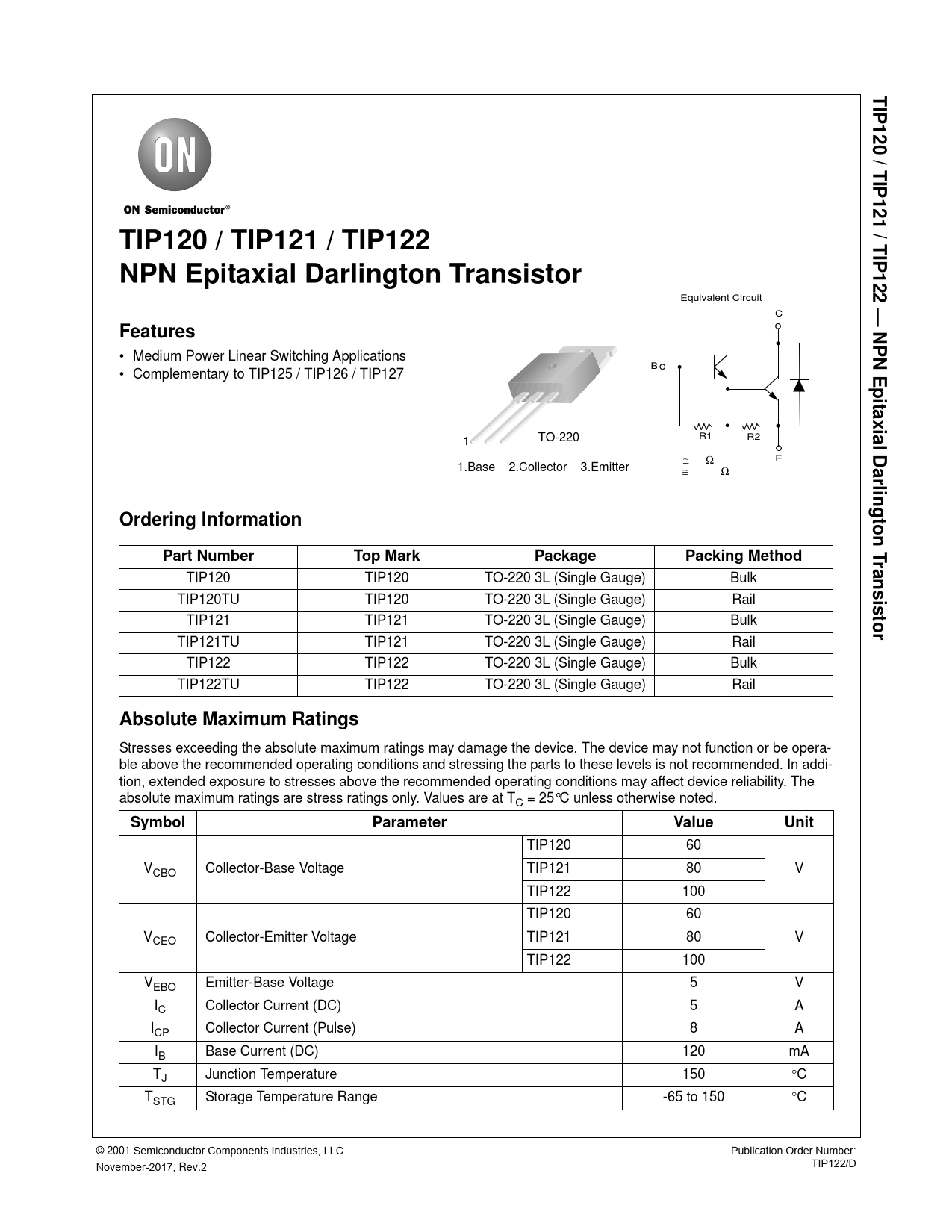 TIP120 60 VCBO Collector-Base Voltage TIP121 80 V TIP122 100 TIP120 60 VCEO Collector-Emitter Voltage TIP121 80 V TIP122 100 VEBO Emitter-Base Voltage 5 V IC Collector Current (DC) 5 A ICP Collector Current (Pulse) 8 A IB Base Current (DC) 120 mA TJ Junction Temperature 150 °C TSTG Storage Temperature Range -65 to 150 °C © 2001 Semiconductor Components Industries, LLC. Publication Order Number: TIP122/D November-2017, Rev.2