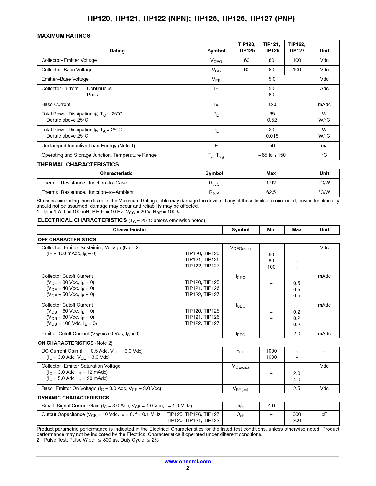 Datasheet TIP120, TIP121, TIP122 (NPN); TIP125, TIP126, TIP127 (PNP) (ON Semiconductor) - 2