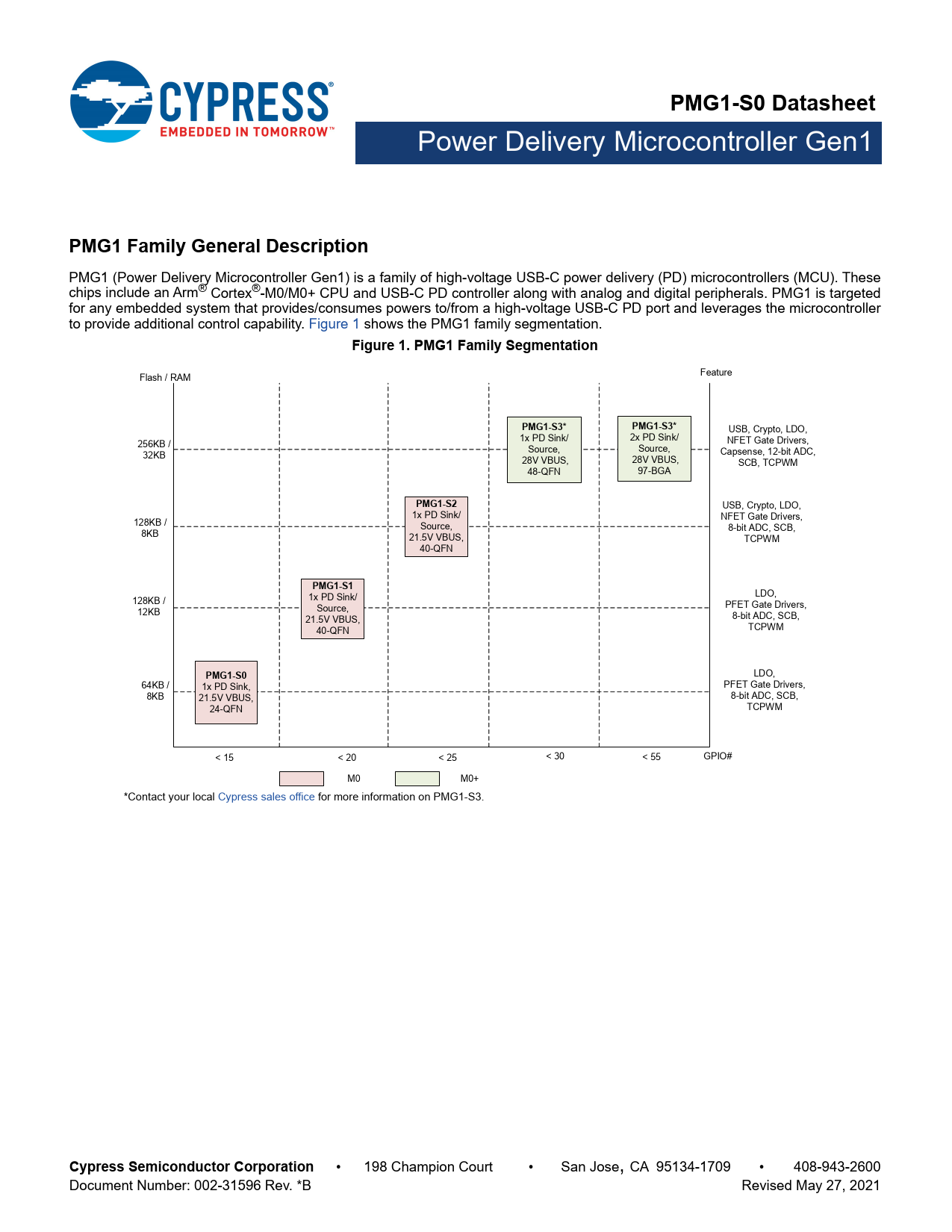 link to page 2 PMG1-S0 Datasheet Power Delivery Microcontroller Gen1 PMG1-S0 Datasheet, Power Delivery Microcontroller Gen1PMG1 Family General Description PMG1 (Power Delivery Microcontroller Gen1) is a family of high-voltage USB-C power delivery (PD) microcontrollers (MCU). These chips include an Arm® Cortex®-M0/M0+ CPU and USB-C PD controller along with analog and digital peripherals. PMG1 is targeted for any embedded system that provides/consumes powers to/from a high-voltage USB-C PD port and leverages the microcontroller to provide additional control capability. Figure 1 shows the PMG1 family segmentation. Figure 1. PMG1 Family Segmentation Flash / RAM Feature PMG1-S3*PMG1-S3* USB, Crypto, LDO, 1x PD Sink/ 2x PD Sink/ 256KB / NFET Gate Drivers, Source, Source, 32KB Capsense, 12-bit ADC, 28V VBUS, 28V VBUS, SCB, TCPWM 48-QFN 97-BGA PMG1-S2 USB, Crypto, LDO, 1x PD Sink/ NFET Gate Drivers, 128KB / Source, 8-bit ADC, SCB, 8KB 21.5V VBUS, TCPWM 40-QFN PMG1-S1 1x PD Sink/ LDO, 128KB / Source, PFET Gate Drivers, 12KB 21.5V VBUS, 8-bit ADC, SCB, 40-QFN TCPWM PMG1-S0 LDO, 64KB / 1x PD Sink, PFET Gate Drivers, 8KB 21.5V VBUS, 8-bit ADC, SCB, 24-QFN TCPWM < 15 < 20 < 25 < 30 < 55 GPIO# M0 M0+ *Contact your local Cypress sales office for more information on PMG1-S3. Cypress Semiconductor Corporation • 198 Champion Court • San Jose, CA 95134-1709 • 408-943-2600 Document Number: 002-31596 Rev. *B Revised May 27, 2021 Document Outline PMG1-S0 Datasheet, Power Delivery Microcontroller Gen1 PMG1 Family General Description PMG1-S0 General Description Features Type-C Support and USB-PD Support Legacy/Proprietary Charging Block System-Level Fault Protection 32-bit MCU Subsystem Clocks and Oscillators Power System-Level ESD Protection Packages Block Diagram Contents Development Support Documentation Online Tools ModusToolbox™ IDE and PMG1 SDK Functional Overview MCU Subsystem CPU Flash SROM USB-PD Subsystem (SS) USB-PD Physical Layer ADC Charger Detection VBUS Undervoltage and Overvoltage Protection VBUS Short Protection PFET Gate Drivers on VBUS Path VBUS Discharge FETs Integrated Digital Blocks Serial Communication Blocks (SCB) Timer/Counter/PWM Block (TCPWM) I/O Subsystem Power Systems Overview Pinouts Application Diagram Electrical Specifications Absolute Maximum Ratings Device-Level Specifications I/O Digital Peripherals Pulse Width Modulation (PWM) for GPIO Pins I2C System Resources Power-on-Reset (POR) with Brown Out SWD Interface Internal Main Oscillator Internal Low-Speed Oscillator Power Down Gate Driver Specifications Analog to Digital Converter Memory Ordering Information Ordering Code Definitions Packaging Acronyms Document Conventions Units of Measure Document History Page Sales, Solutions, and Legal Information Worldwide Sales and Design Support Products PSoC® Solutions Cypress Developer Community Technical Support