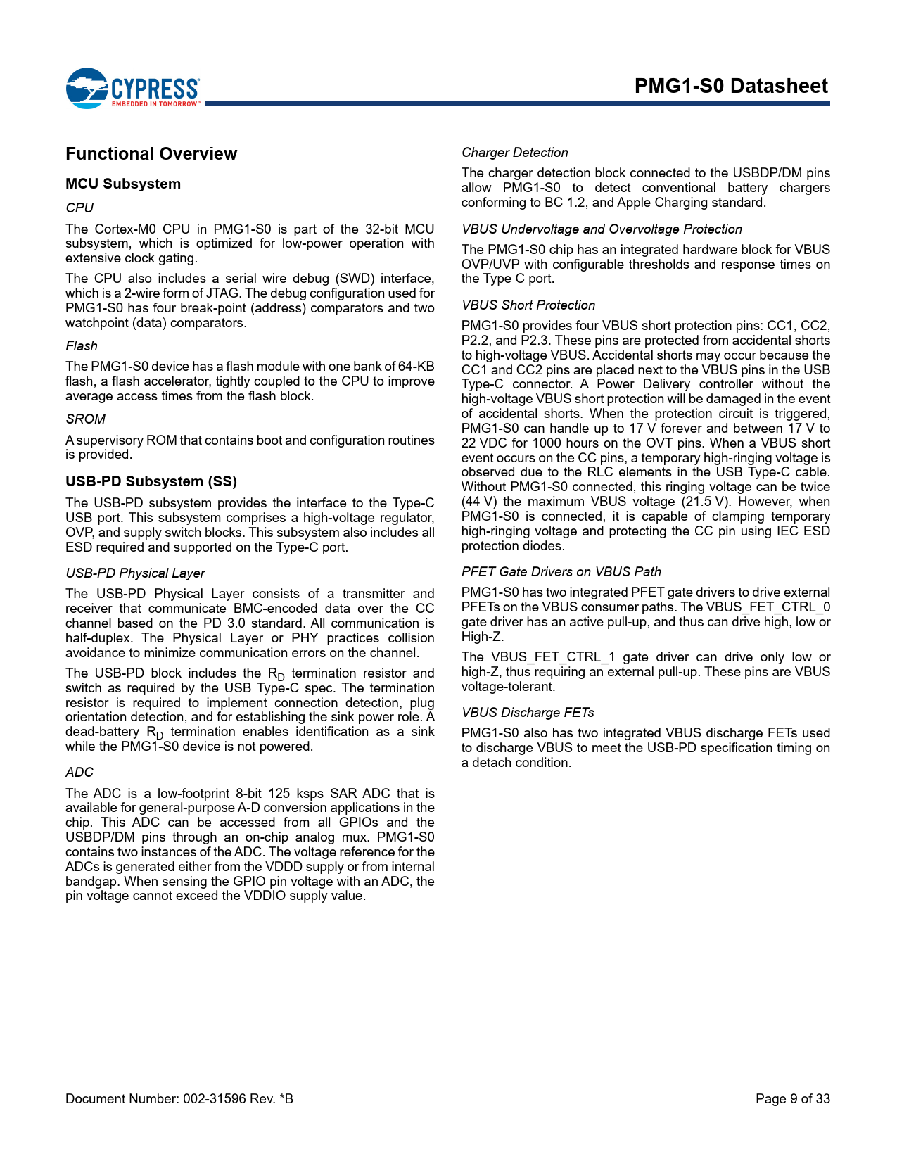PMG1-S0 Datasheet Functional Overview Charger Detection MCU Subsystem The charger detection block connected to the USBDP/DM pins allow PMG1-S0 to detect conventional battery chargers conforming to BC 1.2, and Apple Charging standard. CPU The Cortex-M0 CPU in PMG1-S0 is part of the 32-bit MCU subsystem, which is optimized for low-power operation with extensive clock gating. The CPU also includes a serial wire debug (SWD) interface, which is a 2-wire form of JTAG. The debug configuration used for PMG1-S0 has four break-point (address) comparators and two watchpoint (data) comparators. VBUS Undervoltage and Overvoltage Protection The PMG1-S0 chip has an integrated hardware block for VBUS OVP/UVP with configurable thresholds and response times on the Type C port. VBUS Short Protection The USB-PD subsystem provides the interface to the Type-C USB port. This subsystem comprises a high-voltage regulator, OVP, and supply switch blocks. This subsystem also includes all ESD required and supported on the Type-C port. PMG1-S0 provides four VBUS short protection pins: CC1, CC2, P2.2, and P2.3. These pins are protected from accidental shorts to high-voltage VBUS. Accidental shorts may occur because the CC1 and CC2 pins are placed next to the VBUS pins in the USB Type-C connector. A Power Delivery controller without the high-voltage VBUS short protection will be damaged in the event of accidental shorts. When the protection circuit is triggered, PMG1-S0 can handle up to 17 V forever and between 17 V to 22 VDC for 1000 hours on the OVT pins. When a VBUS short event occurs on the CC pins, a temporary high-ringing voltage is observed due to the RLC elements in the USB Type-C cable. Without PMG1-S0 connected, this ringing voltage can be twice (44 V) the maximum VBUS voltage (21.5 V). However, when PMG1-S0 is connected, it is capable of clamping temporary high-ringing voltage and protecting the CC pin using IEC ESD protection diodes. USB-PD Physical Layer PFET Gate Drivers on VBUS Path The USB-PD Physical Layer consists of a transmitter and receiver that communicate BMC-encoded data over the CC channel based on the PD 3.0 standard. All communication is half-duplex. The Physical Layer or PHY practices collision avoidance to minimize communication errors on the channel. PMG1-S0 has two integrated PFET gate drivers to drive external PFETs on the VBUS consumer paths. The VBUS_FET_CTRL_0 gate driver has an active pull-up, and thus can drive high, low or High-Z. Flash The PMG1-S0 device has a flash module with one bank of 64-KB flash, a flash accelerator, tightly coupled to the CPU to improve average access times from the flash block. SROM A supervisory ROM that contains boot and configuration routines is provided. USB-PD Subsystem (SS) The USB-PD block includes the RD termination resistor and switch as required by the USB Type-C spec. The termination resistor is required to implement connection detection, plug orientation detection, and for establishing the sink power role. A dead-battery RD termination enables identification as a sink while the PMG1-S0 device is not powered. ADC The VBUS_FET_CTRL_1 gate driver can drive only low or high-Z, thus requiring an external pull-up. These pins are VBUS voltage-tolerant. VBUS Discharge FETs PMG1-S0 also has two integrated VBUS discharge FETs used to discharge VBUS to meet the USB-PD specification timing on a detach condition. The ADC is a low-footprint 8-bit 125 ksps SAR ADC that is available for general-purpose A-D conversion applications in the chip. This ADC can be accessed from all GPIOs and the USBDP/DM pins through an on-chip analog mux. PMG1-S0 contains two instances of the ADC. The voltage reference for the ADCs is generated either from the VDDD supply or from internal bandgap. When sensing the GPIO pin voltage with an ADC, the pin voltage cannot exceed the VDDIO supply value. Document Number: 002-31596 Rev. *B Page 9 of 33