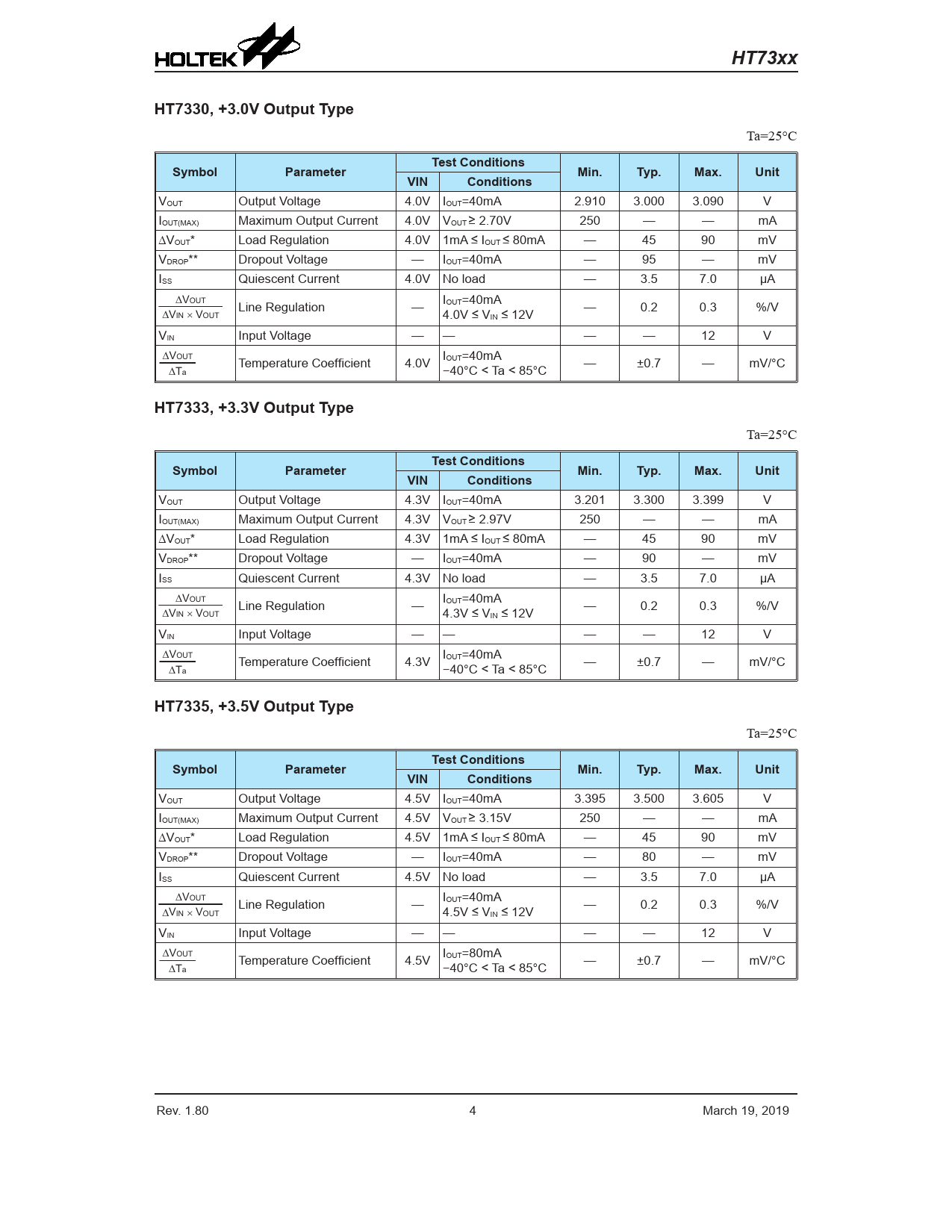 HT73xx. HT7330, +3.0V Output Type. Test Conditions. Symbol. Parameter. Min. Typ. Max. Unit. VIN. Conditions. HT7333, +3.3V Output Type