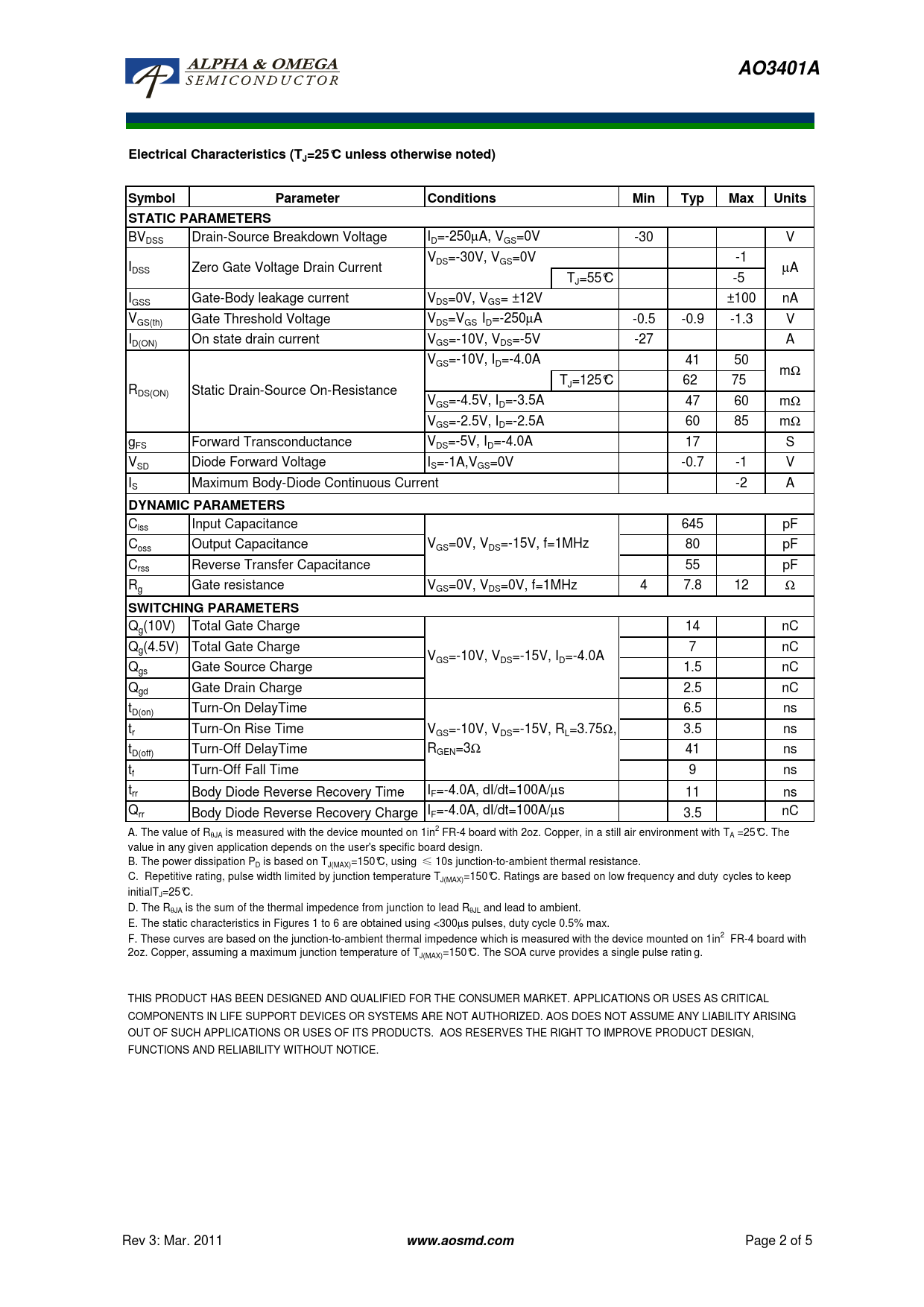 AO3401AElectrical Characteristics (TJ=25°C unless otherwise noted)SymbolParameterConditionsMinTypMaxUnitsSTATIC PARAMETERS BV I DSS Drain-Source Breakdown Voltage D=-250µA, VGS=0V -30 V VDS=-30V, VGS=0V -1 IDSS Zero Gate Voltage Drain Current µA TJ=55°C -5 I Gate-Body leakage current V GSS DS=0V, VGS= ±12V ±100 nA VGS(th) Gate Threshold Voltage VDS=VGS ID=-250µA -0.5 -0.9 -1.3 V I V D(ON) On state drain current GS=-10V, VDS=-5V -27 A VGS=-10V, ID=-4.0A 41 50 mΩ TJ=125°C 62 75 RDS(ON) Static Drain-Source On-Resistance VGS=-4.5V, ID=-3.5A 47 60 mΩ VGS=-2.5V, ID=-2.5A 60 85 mΩ g Forward Transconductance V FS DS=-5V, ID=-4.0A 17 S V Diode Forward Voltage I SD S=-1A,VGS=0V -0.7 -1 V IS Maximum Body-Diode Continuous Current -2 A DYNAMIC PARAMETERS Ciss Input Capacitance 645 pF C V oss Output Capacitance GS=0V, VDS=-15V, f=1MHz 80 pF Crss Reverse Transfer Capacitance 55 pF Rg Gate resistance VGS=0V, VDS=0V, f=1MHz 4 7.8 12 Ω SWITCHING PARAMETERS Qg(10V) Total Gate Charge 14 nC Qg(4.5V) Total Gate Charge 7 nC VGS=-10V, VDS=-15V, ID=-4.0A Qgs Gate Source Charge 1.5 nC Qgd Gate Drain Charge 2.5 nC tD(on) Turn-On DelayTime 6.5 ns tr Turn-On Rise Time V 3.5 ns GS=-10V, VDS=-15V, RL=3.75Ω, t R D(off) Turn-Off DelayTime GEN=3Ω 41 ns tf Turn-Off Fall Time 9 ns trr Body Diode Reverse Recovery Time IF=-4.0A, dI/dt=100A/µs 11 ns Qrr Body Diode Reverse Recovery Charge IF=-4.0A, dI/dt=100A/µs 3.5 nC A. The value of RθJA is measured with the device mounted on 1in2 FR-4 board with 2oz. Copper, in a still air environment with TA =25°C. The value in any given application depends on the user's specific board design. B. The power dissipation PD is based on TJ(MAX)=150°C, using ≤ 10s junction-to-ambient thermal resistance. C. Repetitive rating, pulse width limited by junction temperature TJ(MAX)=150°C. Ratings are based on low frequency and duty cycles to keep initialTJ=25°C. D. The RθJA is the sum of the thermal impedence from junction to lead RθJL and lead to ambient. E. The static characteristics in Figures 1 to 6 are obtained using <300µs pulses, duty cycle 0.5% max. F. These curves are based on the junction-to-ambient thermal impedence which is measured with the device mounted on 1in2 FR-4 board with 2oz. Copper, assuming a maximum junction temperature of TJ(MAX)=150°C. The SOA curve provides a single pulse ratin g. THIS PRODUCT HAS BEEN DESIGNED AND QUALIFIED FOR THE CONSUMER MARKET. APPLICATIONS OR USES AS CRITICAL COMPONENTS IN LIFE SUPPORT DEVICES OR SYSTEMS ARE NOT AUTHORIZED. AOS DOES NOT ASSUME ANY LIABILITY ARISING OUT OF SUCH APPLICATIONS OR USES OF ITS PRODUCTS. AOS RESERVES THE RIGHT TO IMPROVE PRODUCT DESIGN, FUNCTIONS AND RELIABILITY WITHOUT NOTICE. Rev 3: Mar. 2011 www.aosmd.com Page 2 of 5
