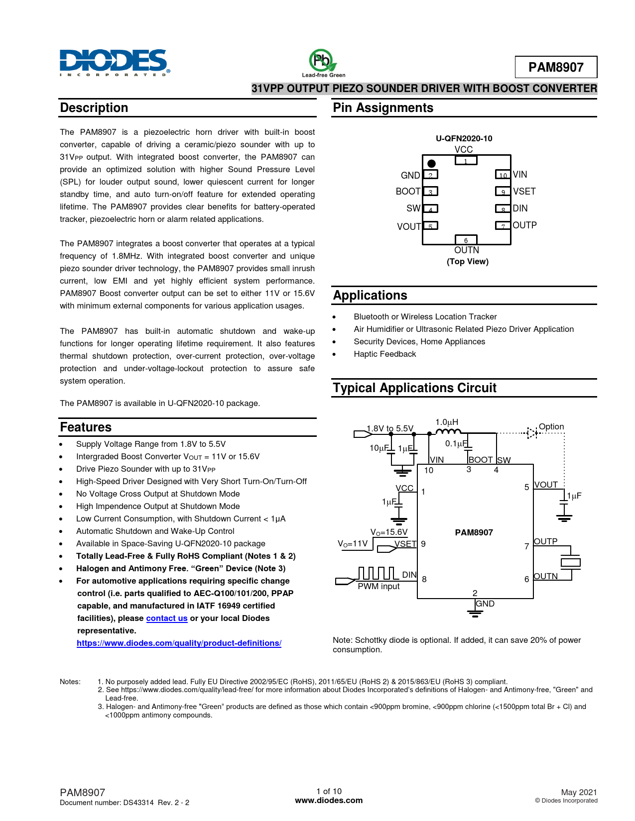 Note: Schottky diode is optional. If added, it can save 20% of power consumption. Notes: 1. No purposely added lead. Fully EU Directive 2002/95/EC (RoHS), 2011/65/EU (RoHS 2) & 2015/863/EU (RoHS 3) compliant. 2. See https://www.diodes.com/quality/lead-free/ for more information about Diodes Incorporated’s definitions of Halogen- and Antimony-free, "Green" and Lead-free. 3. Halogen- and Antimony-free "Green” products are defined as those which contain <900ppm bromine, <900ppm chlorine (<1500ppm total Br + Cl) and <1000ppm antimony compounds. PAM8907 1 of 10 May 2021 Document number: DS43314 Rev. 2 - 2