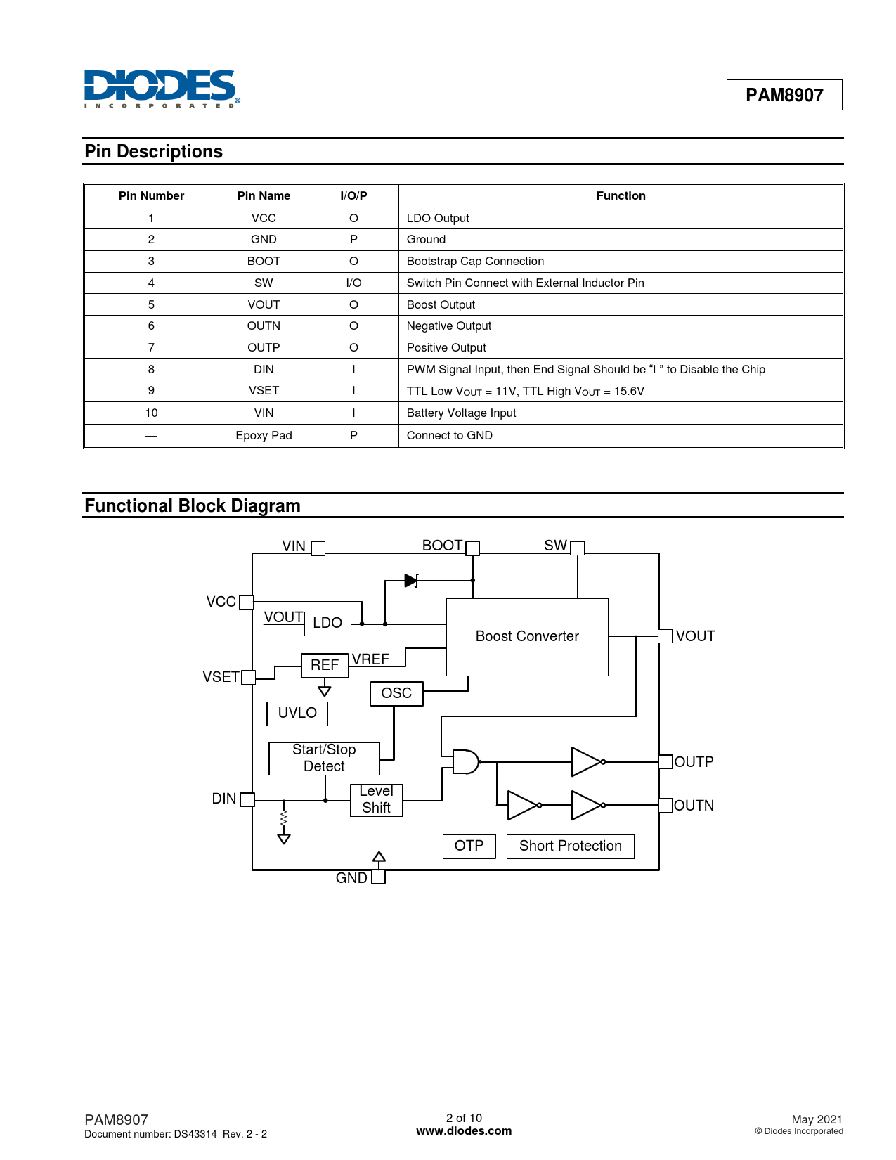 PAM8907. Pin Descriptions. Pin Number. Pin Name. I/O/P. Function. A M. O F. IN D. C N. Functional Block Diagram. A V. D A. www.diodes.com