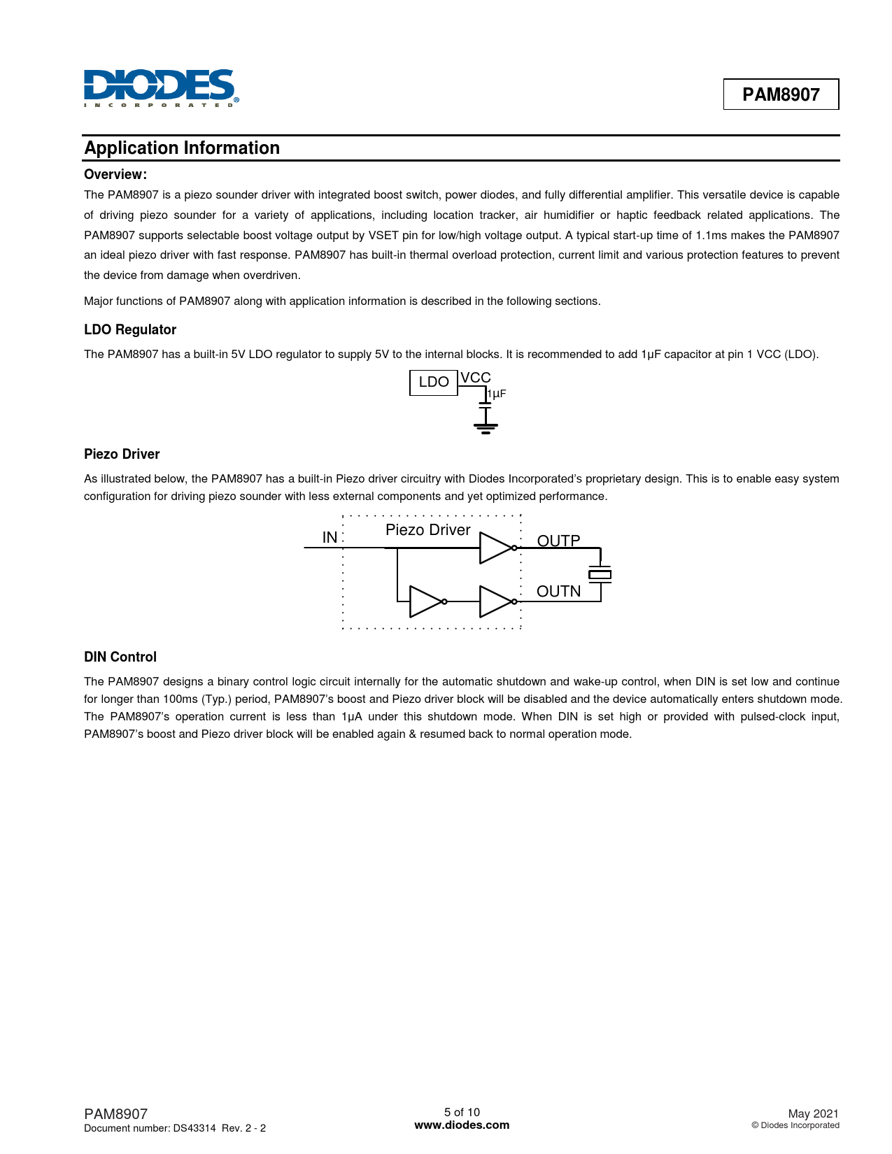 PAM8907. Application Information. Overview:. LDO Regulator. T A. O F. Piezo Driver. D E. N A. D A. DIN Control. www.diodes.com