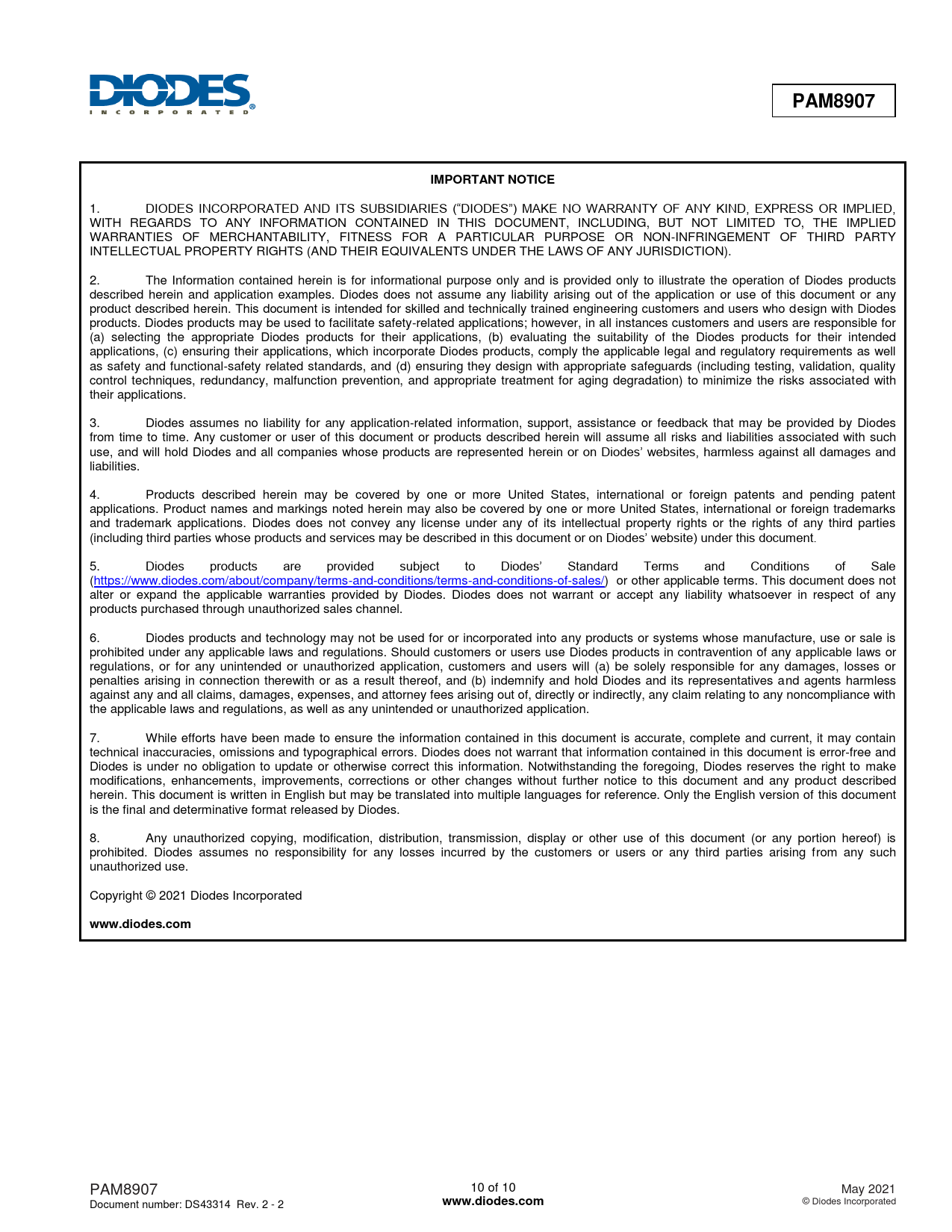 | Seiten / Seite | 10 / 10 — PAM8907. IMPORTANT NOTICE. www.diodes.com |