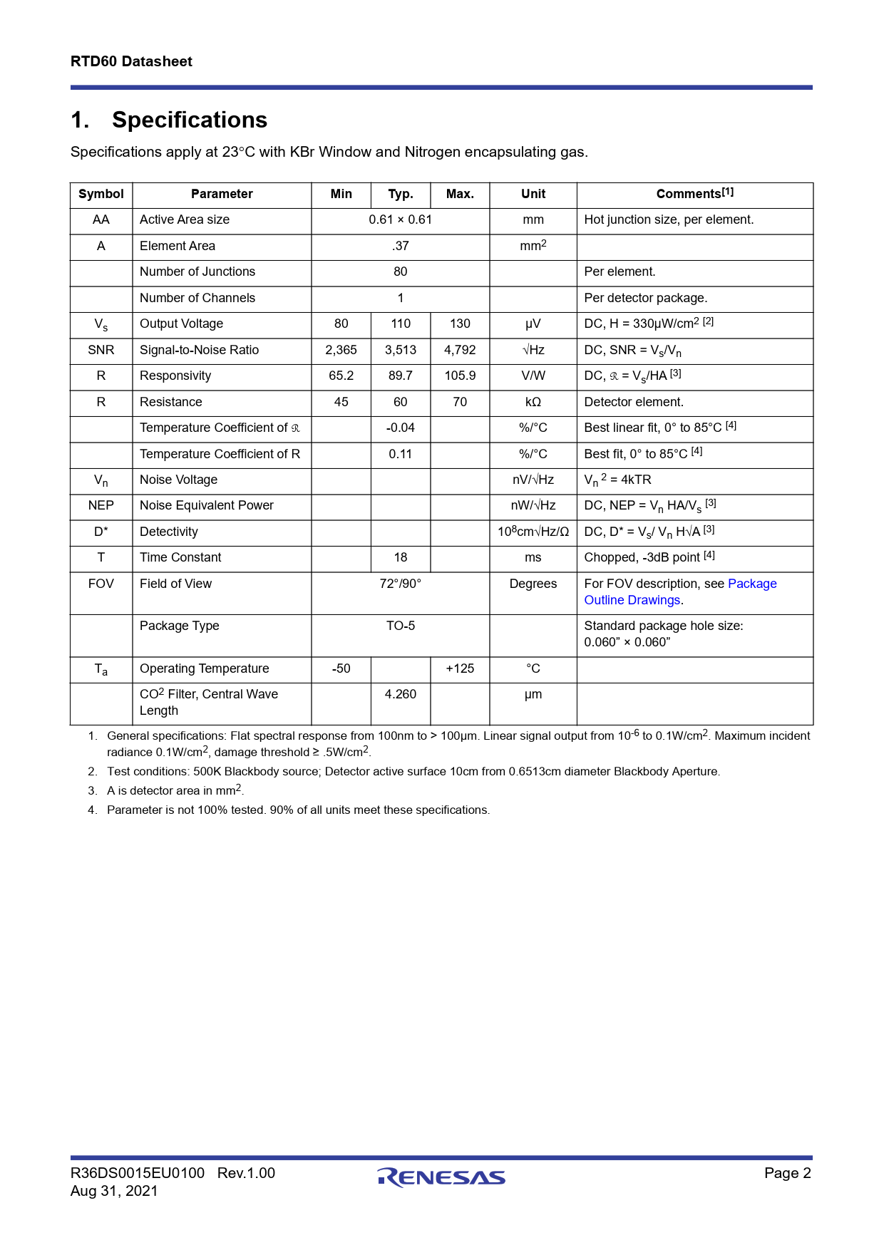 link to page 2 link to page 2 link to page 2 link to page 2 link to page 3 link to page 3 RTD60 Datasheet1. Specifications Specifications apply at 23C with KBr Window and Nitrogen encapsulating gas. SymbolParameterMinTyp.Max.UnitComments[1] AA Active Area size 0.61 × 0.61 mm Hot junction size, per element. A Element Area .37 mm2 Number of Junctions 80 Per element. Number of Channels 1 Per detector package. Vs Output Voltage 80 110 130 µV DC, H = 330µW/cm2 [2] SNR Signal-to-Noise Ratio 2,365 3,513 4,792 √Hz DC, SNR = Vs/Vn R Responsivity 65.2 89.7 105.9 V/W DC, R = Vs/HA [3] R Resistance 45 60 70 kΩ Detector element. Temperature Coef icient of R -0.04 %/°C Best linear fit, 0° to 85°C [4] Temperature Coef icient of R 0.11 %/°C Best fit, 0° to 85°C [4] V 2 n Noise Voltage nV/√Hz Vn = 4kTR NEP Noise Equivalent Power nW/√Hz DC, NEP = Vn HA/Vs [3] D* Detectivity 108cm√Hz/Ω DC, D* = Vs/ Vn H√A [3] T Time Constant 18 ms Chopped, -3dB point [4] FOV Field of View 72°/90° Degrees For FOV description, see Package Outline Drawings. Package Type TO-5 Standard package hole size: 0.060” × 0.060” Ta Operating Temperature -50 +125 °C CO2 Filter, Central Wave 4.260 µm Length 1. General specifications: Flat spectral response from 100nm to > 100µm. Linear signal output from 10-6 to 0.1W/cm2. Maximum incident radiance 0.1W/cm2, damage threshold ≥ .5W/cm2. 2. Test conditions: 500K Blackbody source; Detector active surface 10cm from 0.6513cm diameter Blackbody Aperture. 3. A is detector area in mm2. 4. Parameter is not 100% tested. 90% of al units meet these specifications. R36DS0015EU0100 Rev.1.00 Page 2 Aug 31, 2021 Document Outline Image Diagram Detector Circuit Overlay Applications Features Benefits 1. Specifications 2. Package Outline Drawings 3. Ordering Information 4. Revision History