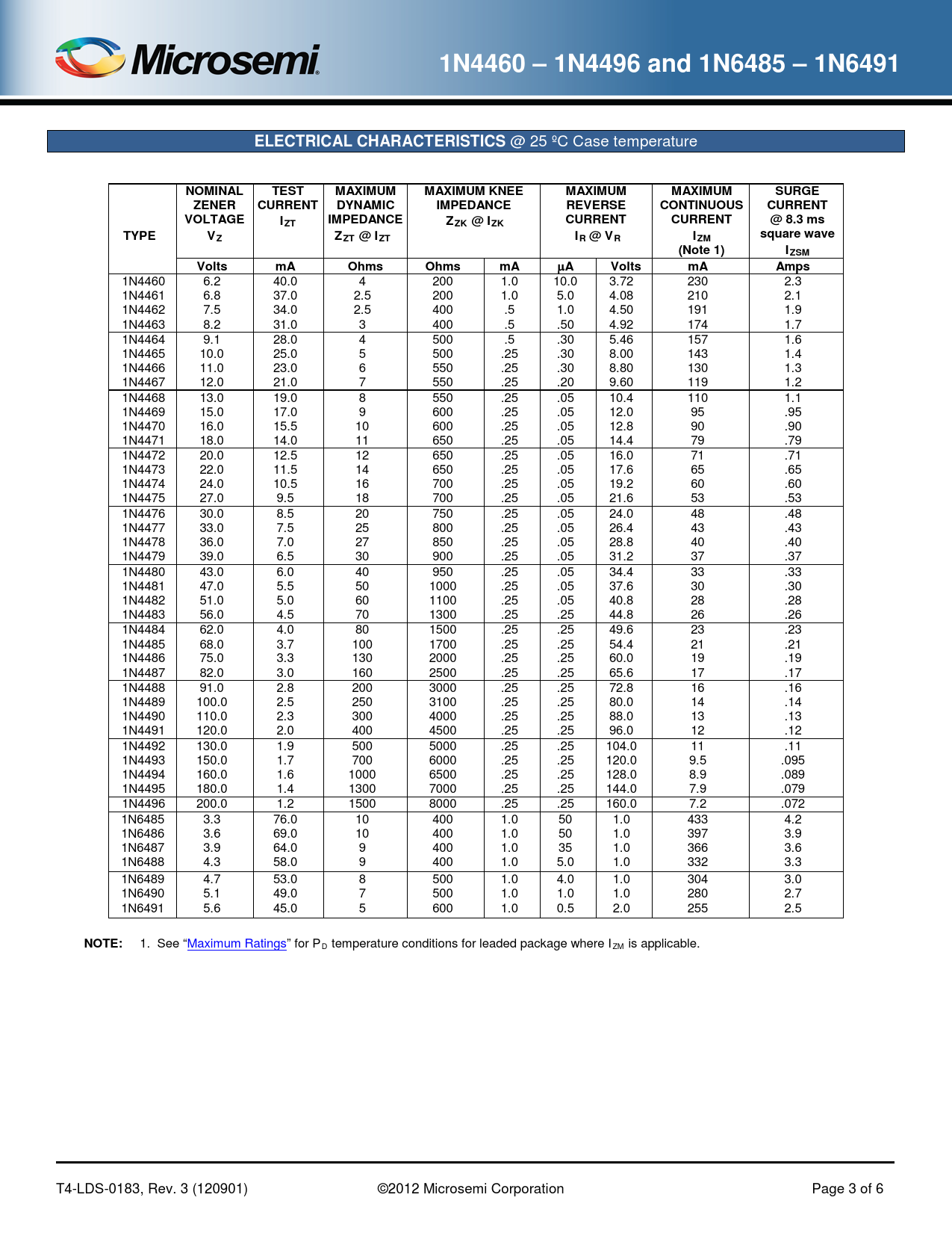 2.5 1. See “Maximum Ratings” for P D temperature conditions for leaded package where I ZM is applicable. T4-LDS-0183, Rev. 3 (120901) ©2012 Microsemi Corporation Page 3 of 6