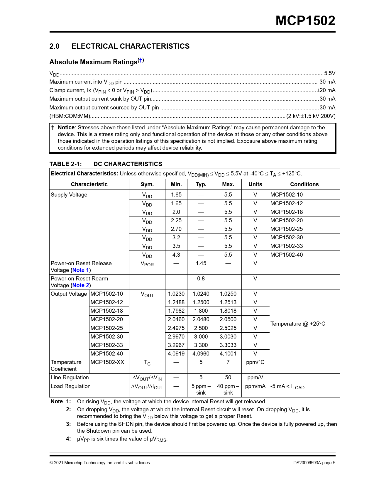 MCP1502. 2.0. ELECTRICAL CHARACTERISTICS. Absolute Maximum Ratings(†. † Notice. TABLE 2-1:. DC CHARACTERISTICS