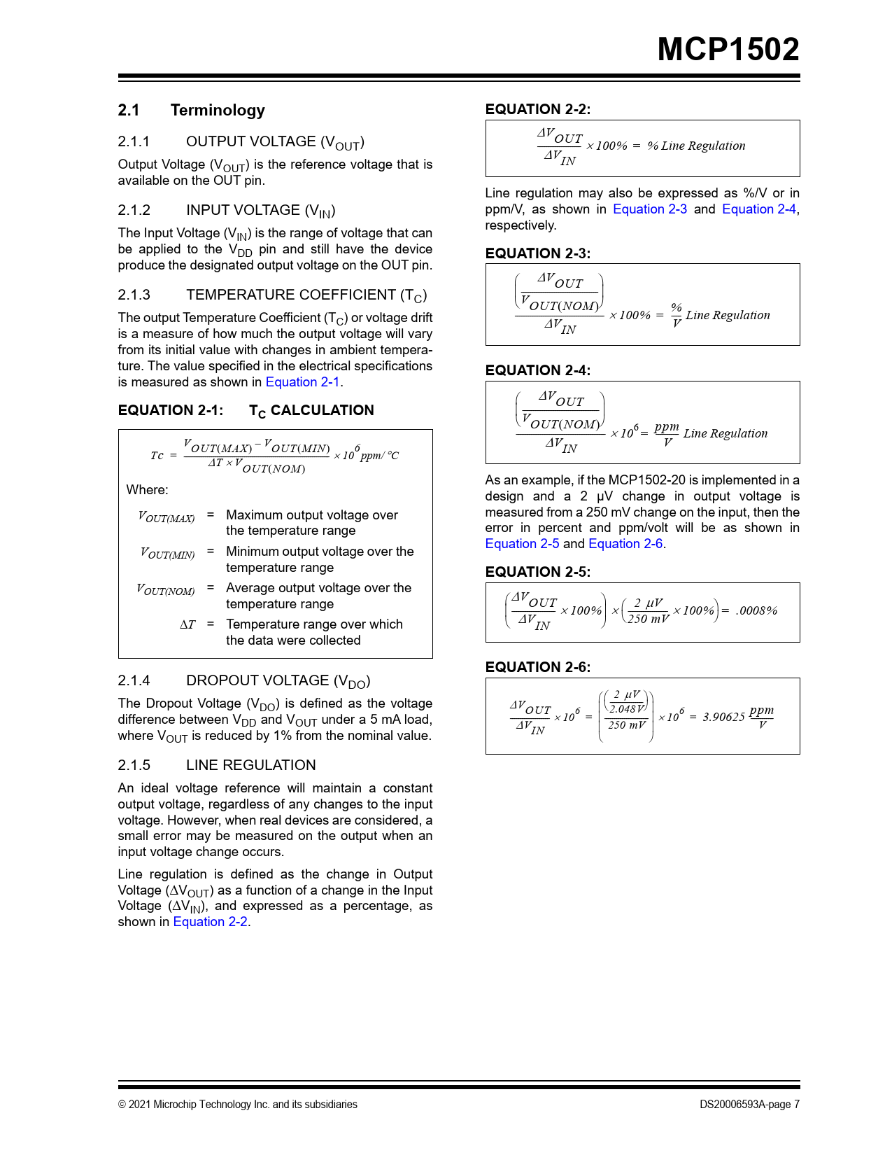 link to page 7 link to page 7 link to page 7 link to page 7 link to page 7 link to page 7 MCP15022.1TerminologyEQUATION 2-2: V 2.1.1 OUTPUT VOLTAGE (V OUT OUT) - --------- 100% % = Line Regulation V Output Voltage (V IN OUT) is the reference voltage that is available on the OUT pin. Line regulation may also be expressed as %/V or in 2.1.2 INPUT VOLTAGE (VIN) ppm/V, as shown in Equation 2-3 and Equation 2-4, respectively. The Input Voltage (VIN) is the range of voltage that can be applied to the VDD pin and still have the device EQUATION 2-3: produce the designated output voltage on the OUT pin. V OUT 2.1.3 TEMPERATURE COEFFICIENT (T ------------------ C) V OUTNOM The output Temperature Coefficient (T --------------------- % 100% = -- Line Regulation C) or voltage drift V V is a measure of how much the output voltage will vary IN from its initial value with changes in ambient tempera- ture. The value specified in the electrical specifications EQUATION 2-4: is measured as shown in Equation 2-1. V EQUATION 2-1:T OUT C CALCULATION ------------------ V OUTNOM --------------------- 106 ppm = ----- Line Regulation V OUTMAX – VOUTMIN 6 VIN V Tc = ------ -------------------------------- 10 ppm/C T VOUTNOM As an example, if the MCP1502-20 is implemented in a Where: design and a 2 μV change in output voltage is V measured from a 250 mV change on the input, then the OUT(MAX) = Maximum output voltage over the temperature range error in percent and ppm/volt wil be as shown in Equation 2-5 and Equation 2-6. VOUT(MIN) = Minimum output voltage over the temperature range EQUATION 2-5: VOUT(NOM) = Average output voltage over the temperature range V OUT 2 V ---------- 100% --------- 100% = .0008% T = Temperature range over which V IN 250 mV the data were col ected EQUATION 2-6: 2.1.4 DROPOUT VOLTAGE (VDO) 2 V The Dropout Voltage (V --------- DO) is defined as the voltage VOUT 6 2.048V 6 ppm difference between V ---------- 10 = ------------ 10 = 3.90625 ------ DD and VOUT under a 5 mA load, V 250 mV V where V IN OUT is reduced by 1% from the nominal value. 2.1.5 LINE REGULATION An ideal voltage reference wil maintain a constant output voltage, regardless of any changes to the input voltage. However, when real devices are considered, a small error may be measured on the output when an input voltage change occurs. Line regulation is defined as the change in Output Voltage (VOUT) as a function of a change in the Input Voltage (VIN), and expressed as a percentage, as shown in Equation 2-2. 2021 Microchip Technology Inc. and its subsidiaries DS20006593A-page 7 Document Outline Features Applications Related Parts General Description Package Types Block Diagram 1.0 Pin Function Table TABLE 1-1: Pin Function Table 1.1 Buffered VREF Output (OUT) 1.2 System Ground (GND) 1.3 Shutdown Pin (SHDN) 1.4 Power Supply Input (VDD) 2.0 Electrical Characteristics Absolute Maximum Ratings(†) TABLE 2-1: DC Characteristics TABLE 2-2: Temperature Specifications 2.1 Terminology 2.1.1 Output Voltage (VOUT) 2.1.2 Input Voltage (VIN) 2.1.3 Temperature Coefficient (Tc) EQUATION 2-1: TC Calculation 2.1.4 Dropout Voltage (VDO) 2.1.5 Line Regulation EQUATION 2-2: EQUATION 2-3: EQUATION 2-4: EQUATION 2-5: EQUATION 2-6: 2.1.6 Load Regulation EQUATION 2-7: EQUATION 2-8: EQUATION 2-9: EQUATION 2-10: EQUATION 2-11: 2.1.7 Power Supply Rejection Ratio (PSRR) 2.1.8 Long-Term Drift 2.1.9 Output Voltage Hysteresis 2.1.10 Layout Consideration for Load Regulation 3.0 Typical Operating Curves FIGURE 3-1: MCP1502-10 VREF Output vs. Temperature, VDD = 5.5V. FIGURE 3-2: MCP1502-20 VREF Output vs. Temperature, VDD = 5.5V. FIGURE 3-3: MCP1502-40 VREF Output vs. Temperature, VDD = 5.5V. FIGURE 3-4: Load Regulation vs. Temperature. FIGURE 3-5: IDD vs. Temperature. FIGURE 3-6: MCP1502 – Line Regulation vs. Temperature. FIGURE 3-7: IDD vs. VDD for All Options. FIGURE 3-8: Noise vs. Frequency, No Load, TA = +25°C. FIGURE 3-9: PSRR vs. Frequency, No Load, TA = +25°C. FIGURE 3-10: PSRR vs. Frequency, 1 kΩ Load, TA = +25°C. FIGURE 3-11: Dropout Voltage vs. Load, TA = +25°C. FIGURE 3-12: MCP1502 Tempco Distribution, No Load, VDD = 2.7V. FIGURE 3-13: MCP1502 Tempco Distribution, No Load, VDD = 5.5V. FIGURE 3-14: VOUT Drift vs. Time, TA = +25°C, No Load, 800 Units. FIGURE 3-15: MCP1502-10 VREF and Load Regulation vs. Load Current. FIGURE 3-16: MCP1502-20 VREF and Load Regulation vs. Load Current. FIGURE 3-17: MCP1502-40 VREF and Load Regulation vs. Load Current. FIGURE 3-18: MCP1502 Output Voltage Histogram, VDD = 2.7V. FIGURE 3-19: MCP1502 Output Voltage Histogram, VDD = 5.5V. FIGURE 3-20: Fast Ramp Start-up @ +25°C for All Options. FIGURE 3-21: Slow Ramp Start-up @ +25°C for All Options. FIGURE 3-22: IDD Turn-On Transient Response. FIGURE 3-23: Shutdown Low-to-High Slow Ramp Turn-On Transient Response @ +25°C for All Options. FIGURE 3-24: Load Regulation Transient Response @ +25°C for All Options. FIGURE 3-25: Line Regulation Transient Response @ +25°C for All Options. FIGURE 3-26: MCP1502-10 Transient Response vs. Capacitive Load, VDD = 5V. FIGURE 3-27: MCP1502-20 Transient Response vs. Capacitive Load, VDD = 5V. FIGURE 3-28: MCP1502-40 Transient Response vs. Capacitive Load, VDD = 5V. FIGURE 3-29: MCP1502-10 Transient Response vs. RS, VDD = 5V, CL = 4.7 nF. FIGURE 3-30: MCP1502-20 Transient Response vs. RS, VDD = 5V, CL = 4.7 nF. FIGURE 3-31: MCP1502-40 Transient Response vs. RS, VDD = 5V, CL = 4.7 nF. FIGURE 3-32: MCP1502-10 Transient Response vs. VDD, CL = 4.7 nF. FIGURE 3-33: MCP1502-20 Transient Response vs. VDD, CL = 4.7 nF. FIGURE 3-34: MCP1502-40 Transient Response vs. VDD, CL = 4.7 nF. 4.0 Theory of Operation 5.0 Application Circuits 5.1 Application Tips 5.1.1 Basic Application Circuit FIGURE 5-1: Basic Circuit Configuration. FIGURE 5-2: Output Noise Reducing Filter. EQUATION 5-1: 5.1.2 Load Capacitor 5.1.3 Printed Circuit Board Layout Considerations 5.2 Typical Applications Circuits 5.2.1 Negative Voltage Reference FIGURE 5-3: Negative Vo