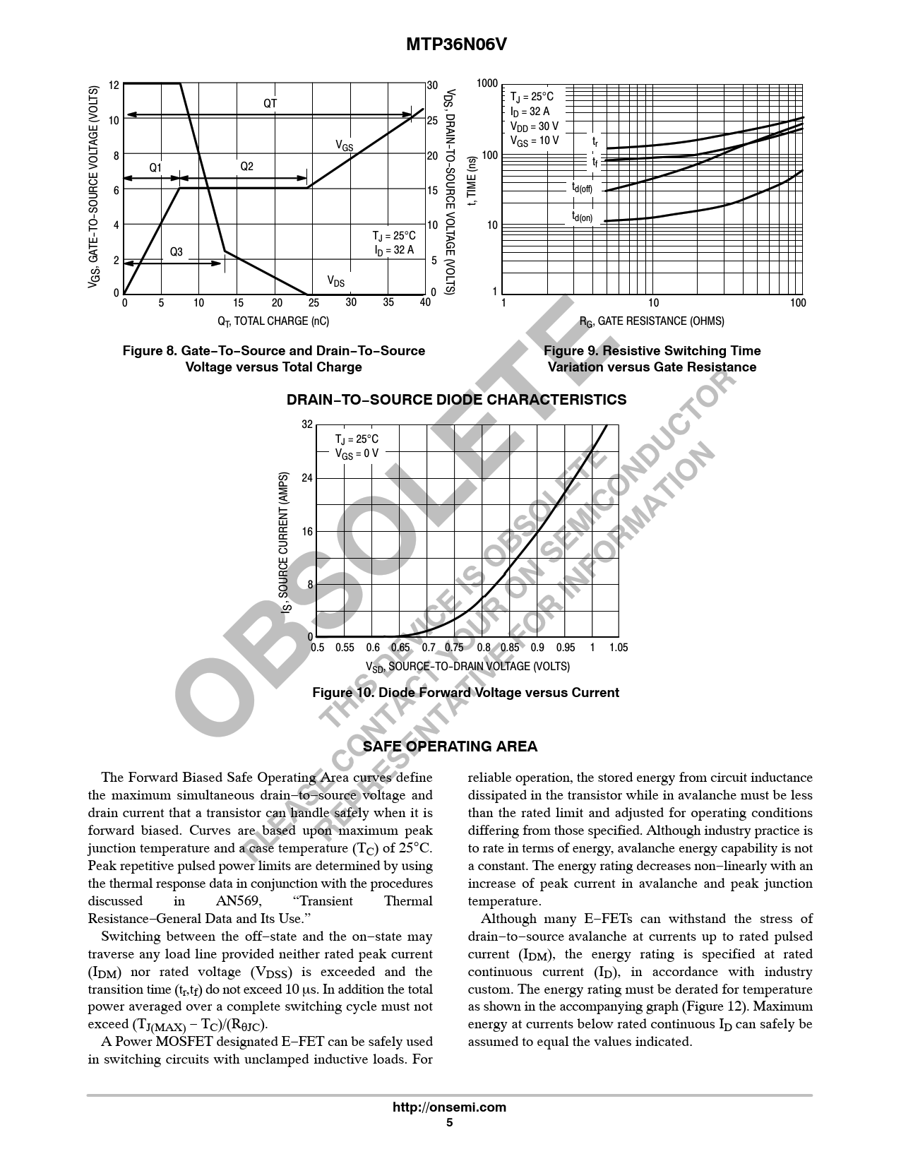 The Forward Biased Safe Operating Area curves define reliable operation, the stored energy from circuit inductance the maximum simultaneous drain−to−source voltage and dissipated in the transistor while in avalanche must be less drain current that a transistor can handle safely when it is than the rated limit and adjusted for operating conditions forward biased. Curves are based upon maximum peak differing from those specified. Although industry practice is junction temperature and a case temperature (TC) of 25°C. to rate in terms of energy, avalanche energy capability is not Peak repetitive pulsed power limits are determined by using a constant. The energy rating decreases non−linearly with an the thermal response data in conjunction with the procedures increase of peak current in avalanche and peak junction discussed in AN569, “Transient Thermal temperature. Resistance−General Data and Its Use.” Although many E−FETs can withstand the stress of Switching between the off−state and the on−state may drain−to−source avalanche at currents up to rated pulsed traverse any load line provided neither rated peak current current (IDM), the energy rating is specified at rated (IDM) nor rated voltage (VDSS) is exceeded and the continuous current (ID), in accordance with industry transition time (tr,tf) do not exceed 10 μs. In addition the total custom. The energy rating must be derated for temperature power averaged over a complete switching cycle must not as shown in the accompanying graph (Figure 12). Maximum exceed (TJ(MAX) − TC)/(RθJC). energy at currents below rated continuous ID can safely be A Power MOSFET designated E−FET can be safely used assumed to equal the values indicated. in switching circuits with unclamped inductive loads. For