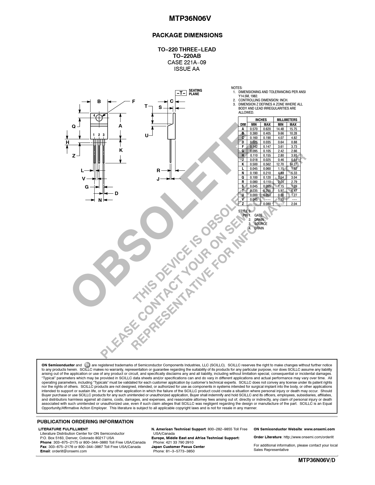 MTP36N06VPACKAGE DIMENSIONSTO−220 THREE−LEADTO−220AB CASE 221A−09 ISSUE AA NOTES: SEATING 1. DIMENSIONING AND TOLERANCING PER ANSI −T− PLANE Y14.5M, 1982. 2. CONTROLLING DIMENSION: INCH. BFC 3. DIMENSION Z DEFINES A ZONE WHERE ALL TS BODY AND LEAD IRREGULARITIES ARE ALLOWED. 4 INCHES MILLIMETERS DIM MIN MAX MIN MAX QA A 0.570 0.620 14.48 15.75 B 0.380 0.405 9.66 10.28 1 2 3 U C 0.160 0.190 4.07 4.82 H D 0.025 0.035 0.64 0.88 F 0.142 0.147 3.61 3.73 K G 0.095 0.105 2.42 2.66 Z H 0.110 0.155 2.80 3.93 J 0.018 0.025 0.46 0.64 K 0.500 0.562 12.70 14.27 L 0.045 0.060 1.15 1.52 LR N 0.190 0.210 4.83 5.33 Q 0.100 0.120 2.54 3.04 VJ R 0.080 0.110 2.04 2.79 G S 0.045 0.055 1.15 1.39 T 0.235 0.255 5.97 6.47 D U 0.000 0.050 0.00 1.27 N V 0.045 −−− 1.15 −−− Z −−− 0.080 −−− 2.04 STYLE 5: PIN 1. GATE 2. DRAIN 3. SOURCE 4. DRAIN ON Semiconductor and are registered trademarks of Semiconductor Components Industries, LLC (SCILLC). SCILLC reserves the right to make changes without further notice to any products herein. SCILLC makes no warranty, representation or guarantee regarding the suitability of its products for any particular purpose, nor does SCILLC assume any liability arising out of the application or use of any product or circuit, and specifically disclaims any and all liability, including without limitation special, consequential or incidental damages. “Typical” parameters which may be provided in SCILLC data sheets and/or specifications can and do vary in different applications and actual performance may vary over time. All operating parameters, including “Typicals” must be validated for each customer application by customer’s technical experts. SCILLC does not convey any license under its patent rights nor the rights of others. SCILLC products are not designed, intended, or authorized for use as components in systems intended for surgical implant into the body, or other applications intended to support or sustain life, or for any other application in which the failure of the SCILLC product could create a situation where personal injury or death may occur. Should Buyer purchase or use SCILLC products for any such unintended or unauthorized application, Buyer shall indemnify and hold SCILLC and its officers, employees, subsidiaries, affiliates, and distributors harmless against all claims, costs, damages, and expenses, and reasonable attorney fees arising out of, directly or indirectly, any claim of personal injury or death associated with such unintended or unauthorized use, even if such claim alleges that SCILLC was negligent regarding the design or manufacture of the part. SCILLC is an Equal Opportunity/Affirmative Action Employer. This literature is subject to all applicable copyright laws and is not for resale in any manner. PUBLICATION ORDERING INFORMATIONLITERATURE FULFILLMENT : N. American Technical Support : 800−282−9855 Toll Free ON Semiconductor Website : www.onsemi.com Literature Distribution Center for ON Semiconductor USA/Canada P.O. Box 5163, Denver, Colorado 80217 USA Europe, Middle East and Africa Technical Support:Order Literature : http://www.onsemi.com/orderlit Phone : 303−675−2175 or 800−344−3860 Toll Free USA/Canada Phone: 421 33 790 2910 Fax : 303−675−2176 or 800−344−3867 Toll Free USA/Canada Japan Customer Focus Center For additional information, please contact your local Email : orderlit@onsemi.com Phone: 81−3−5773−3850 Sales Representative http://onsemi.comMTP36N06V/D7