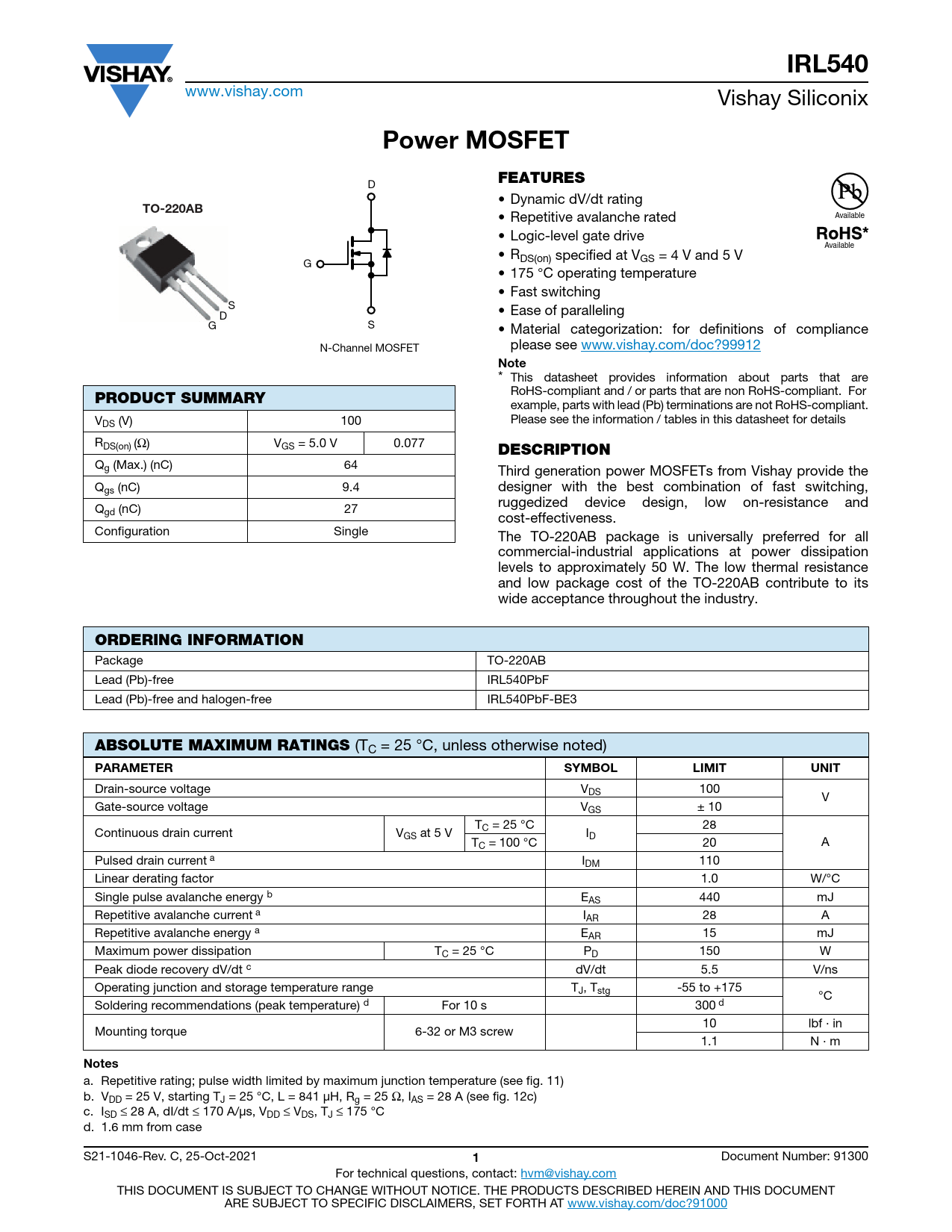 a. Repetitive rating; pulse width limited by maximum junction temperature (see fig. 11) b. VDD = 25 V, starting TJ = 25 °C, L = 841 μH, Rg = 25 Ω, IAS = 28 A (see fig. 12c) c. ISD ≤ 28 A, dI/dt ≤ 170 A/μs, VDD ≤ VDS, TJ ≤ 175 °C d. 1.6 mm from case S21-1046-Rev. C, 25-Oct-2021