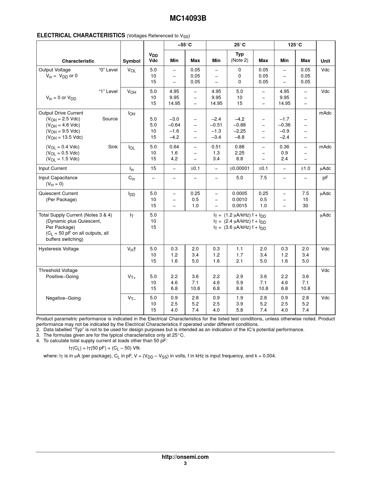 MC14093B. ELECTRICAL CHARACTERISTICS. −55. 125. VDD. Typ. Characteristic. Symbol. Vdc. Min. Max. Unit. http://onsemi.com