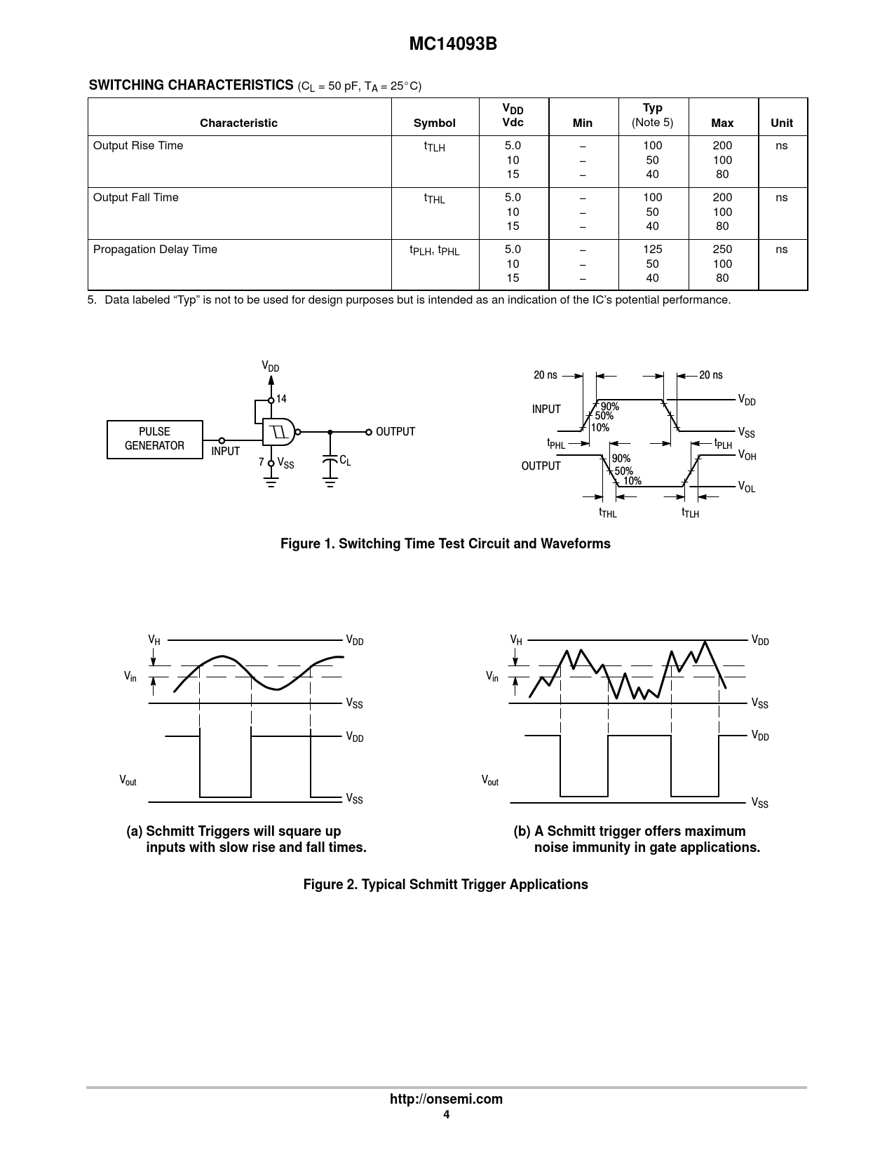 (a) Schmitt Triggers will square up (b) A Schmitt trigger offers maximum (a) inputs with slow rise and fall times. (b) noise immunity in gate applications. Figure 2. Typical Schmitt Trigger Applications http://onsemi.com 4
