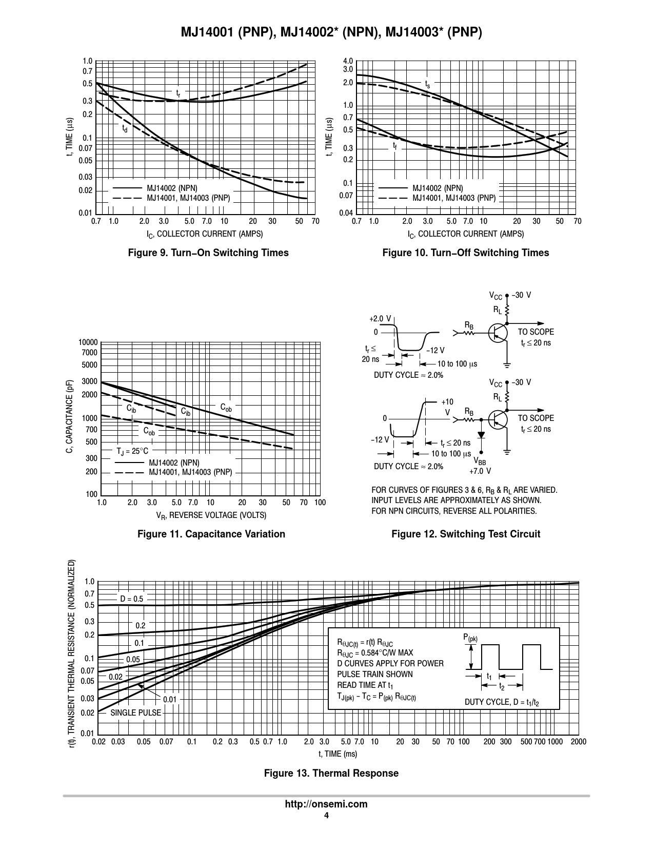 MJ14001 (PNP), MJ14002* (NPN), MJ14003* (PNP). Figure 9. Turn−On Switching Times. Figure 10. Turn−Off Switching Times