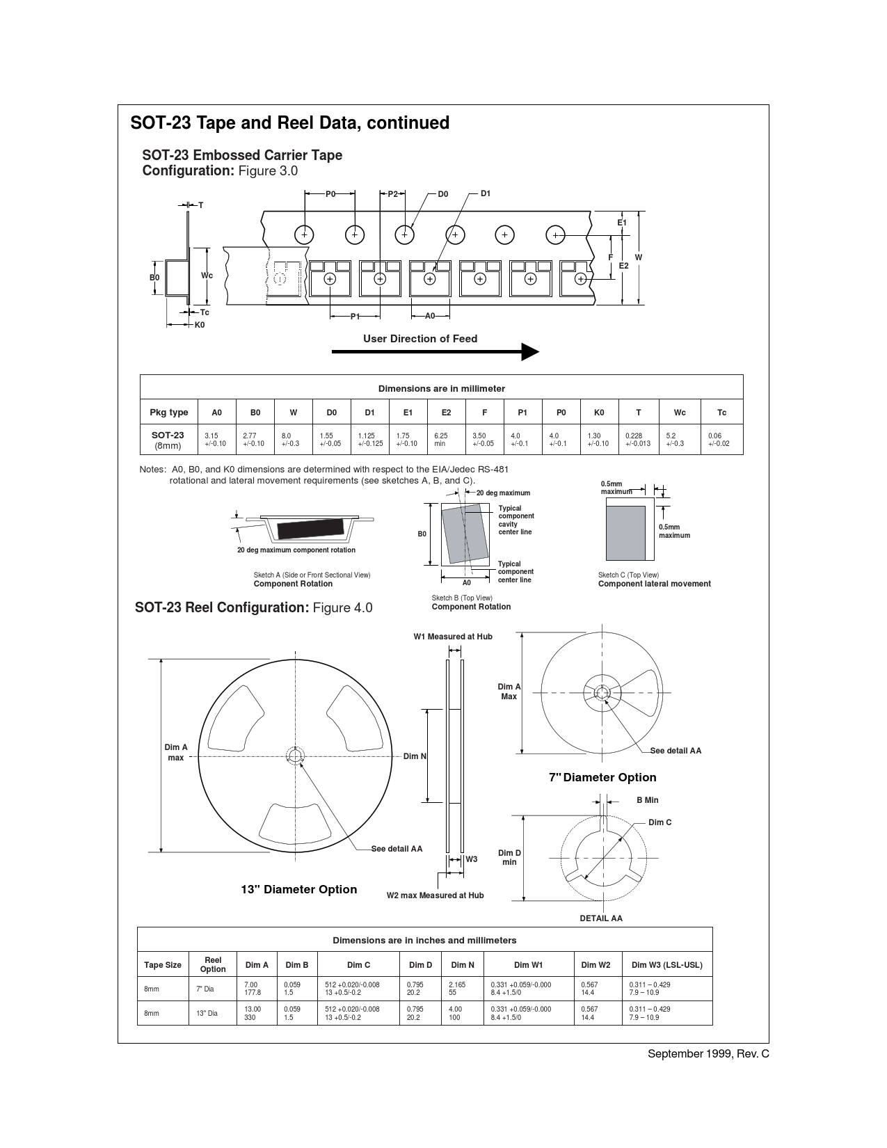 A0 Component Rotation Sketch C (Top View) Component lateral movement Sketch B (Top View) SOT-23 Reel Configuration: Figure 4.0 Component Rotation W1 Measured at Hub Dim A