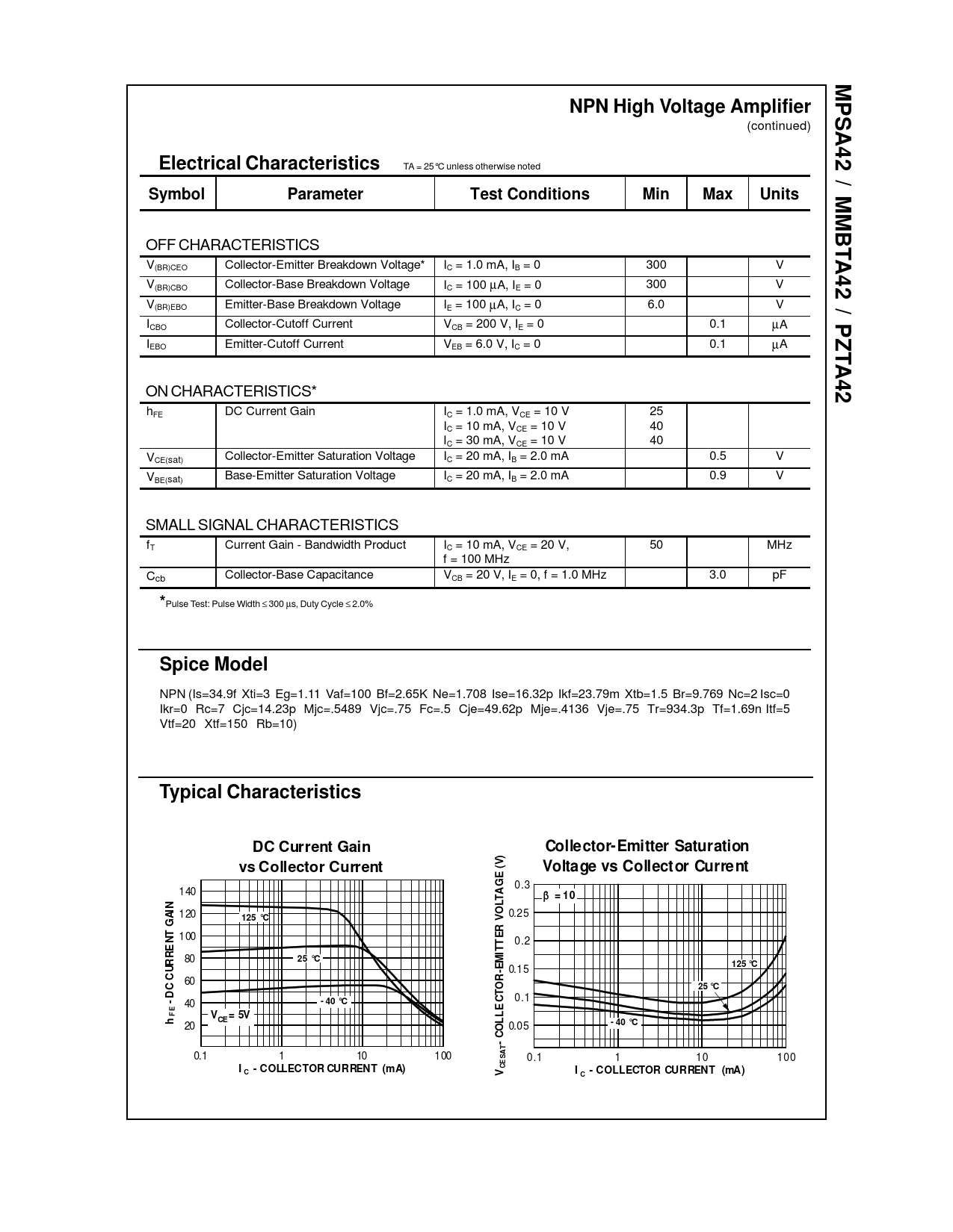 MPSA42 / MMBT. NPN High Voltage Amplifier. Electrical Characteristics. Symbol. Parameter. Test Conditions. Min. Max. Units. A42 / PZT. A42