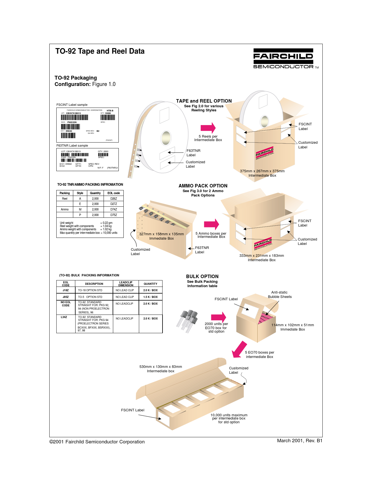 STRAIGHT FOR: PKG 94 (PROELECTRON SERIES 2000 units per 114mm x 102mm x 51mm BCXXX, BFXXX, BSRXXX), EO70 box for Immediate Box 97, 98 std option 5 EO70 boxes per intermediate Box 530mm x 130mm x 83mm Customized Intermediate box Label FSCINT Label 10,000 units maximum per intermediate box for std option March 2001, Rev. B1 ©2001 Fairchild Semiconductor Corporation