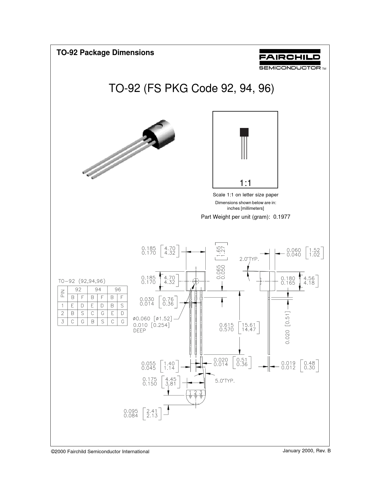TO-92 (FS PKG Code 92, 94, 96) 1:1 Scale 1:1 on letter size paper Dimensions shown below are in: inches [millimeters] Part Weight per unit (gram): 0.1977 ©2000 Fairchild Semiconductor International January 2000, Rev. B
