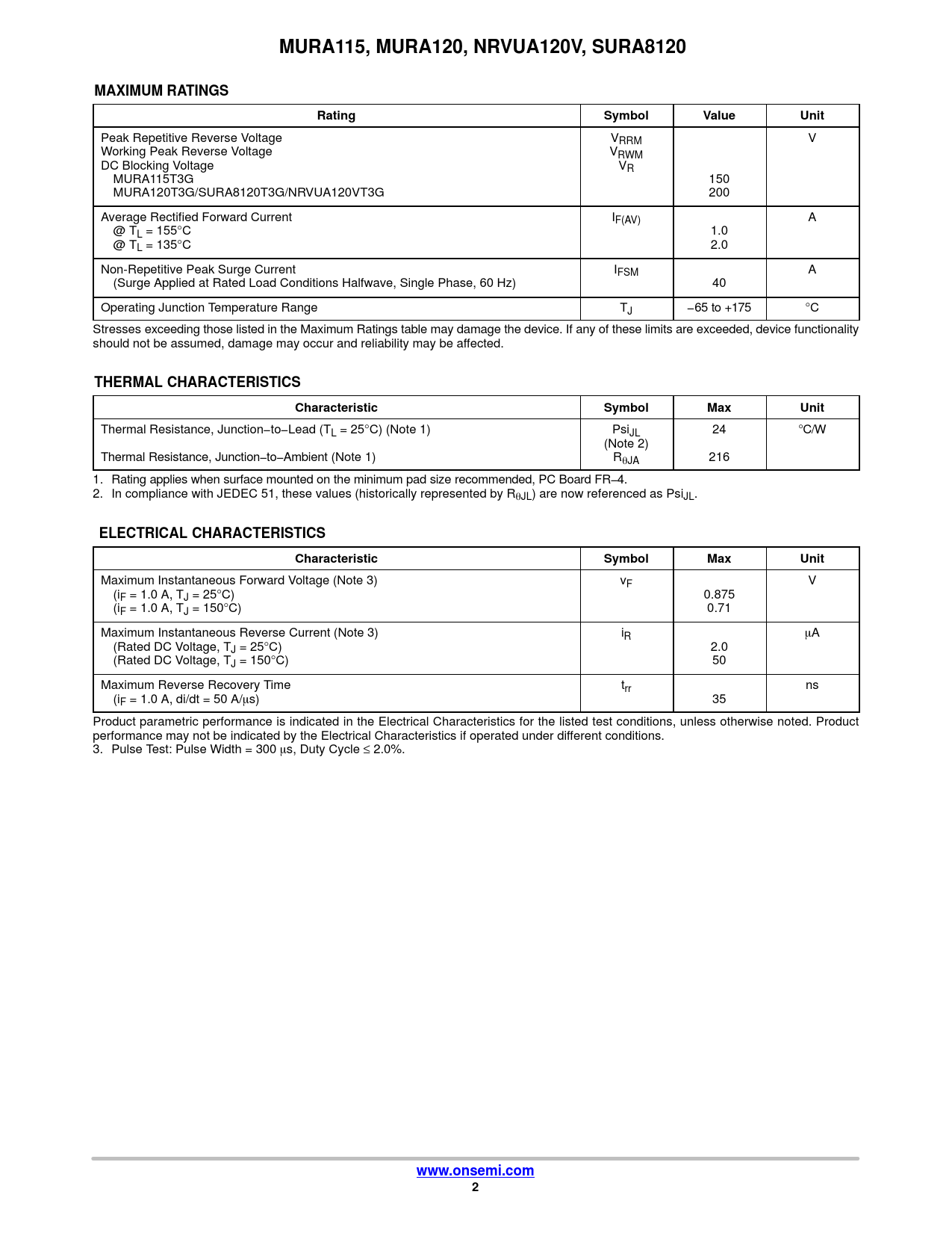 link to page 2 link to page 2 link to page 2 link to page 2 link to page 2 MURA115, MURA120, NRVUA120V, SURA8120MAXIMUM RATINGSRatingSymbolValueUnit Peak Repetitive Reverse Voltage VRRM V Working Peak Reverse Voltage VRWM DC Blocking Voltage VR MURA115T3G 150 MURA120T3G/SURA8120T3G/NRVUA120VT3G 200 Average Rectified Forward Current IF(AV) A @ TL = 155°C 1.0 @ TL = 135°C 2.0 Non-Repetitive Peak Surge Current IFSM A (Surge Applied at Rated Load Conditions Halfwave, Single Phase, 60 Hz) 40 Operating Junction Temperature Range TJ −65 to +175 °C Stresses exceeding those listed in the Maximum Ratings table may damage the device. If any of these limits are exceeded, device functionality should not be assumed, damage may occur and reliability may be affected. THERMAL CHARACTERISTICSCharacteristicSymbolMaxUnit Thermal Resistance, Junction−to−Lead (TL = 25°C) (Note 1) PsiJL 24 °C/W (Note 2) Thermal Resistance, Junction−to−Ambient (Note 1) RqJA 216 1. Rating applies when surface mounted on the minimum pad size recommended, PC Board FR−4. 2. In compliance with JEDEC 51, these values (historically represented by RqJL) are now referenced as PsiJL. ELECTRICAL CHARACTERISTICSCharacteristicSymbolMaxUnit Maximum Instantaneous Forward Voltage (Note 3) vF V (iF = 1.0 A, TJ = 25°C) 0.875 (iF = 1.0 A, TJ = 150°C) 0.71 Maximum Instantaneous Reverse Current (Note 3) iR mA (Rated DC Voltage, TJ = 25°C) 2.0 (Rated DC Voltage, TJ = 150°C) 50 Maximum Reverse Recovery Time trr ns (iF = 1.0 A, di/dt = 50 A/ms) 35 Product parametric performance is indicated in the Electrical Characteristics for the listed test conditions, unless otherwise noted. Product performance may not be indicated by the Electrical Characteristics if operated under different conditions. 3. Pulse Test: Pulse Width = 300 ms, Duty Cycle ≤ 2.0%. www.onsemi.com2