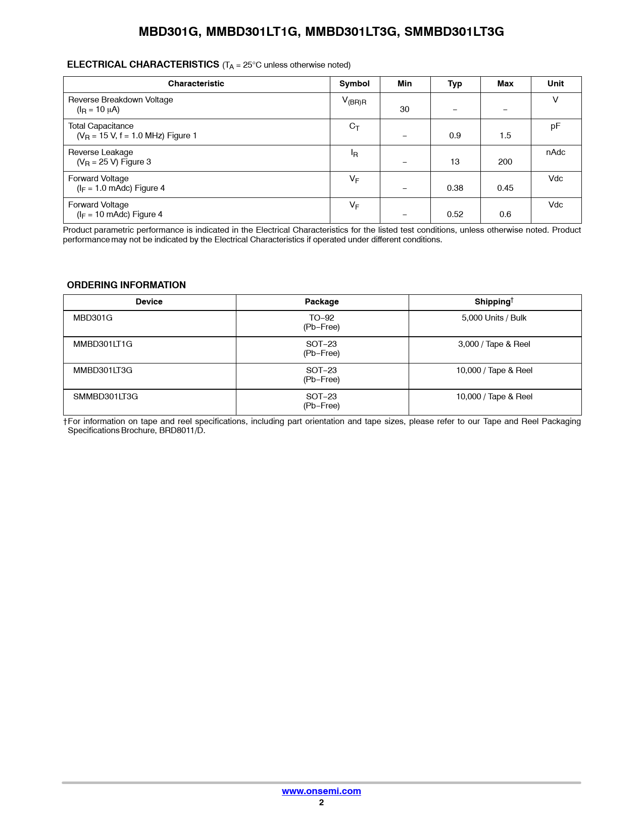 † MBD301G TO−92 5,000 Units / Bulk (Pb−Free) MMBD301LT1G SOT−23 3,000 / Tape & Reel (Pb−Free) MMBD301LT3G SOT−23 10,000 / Tape & Reel (Pb−Free) SMMBD301LT3G SOT−23 10,000 / Tape & Reel (Pb−Free) †For information on tape and reel specifications, including part orientation and tape sizes, please refer to our Tape and Reel Packaging Specifications Brochure, BRD8011/D.