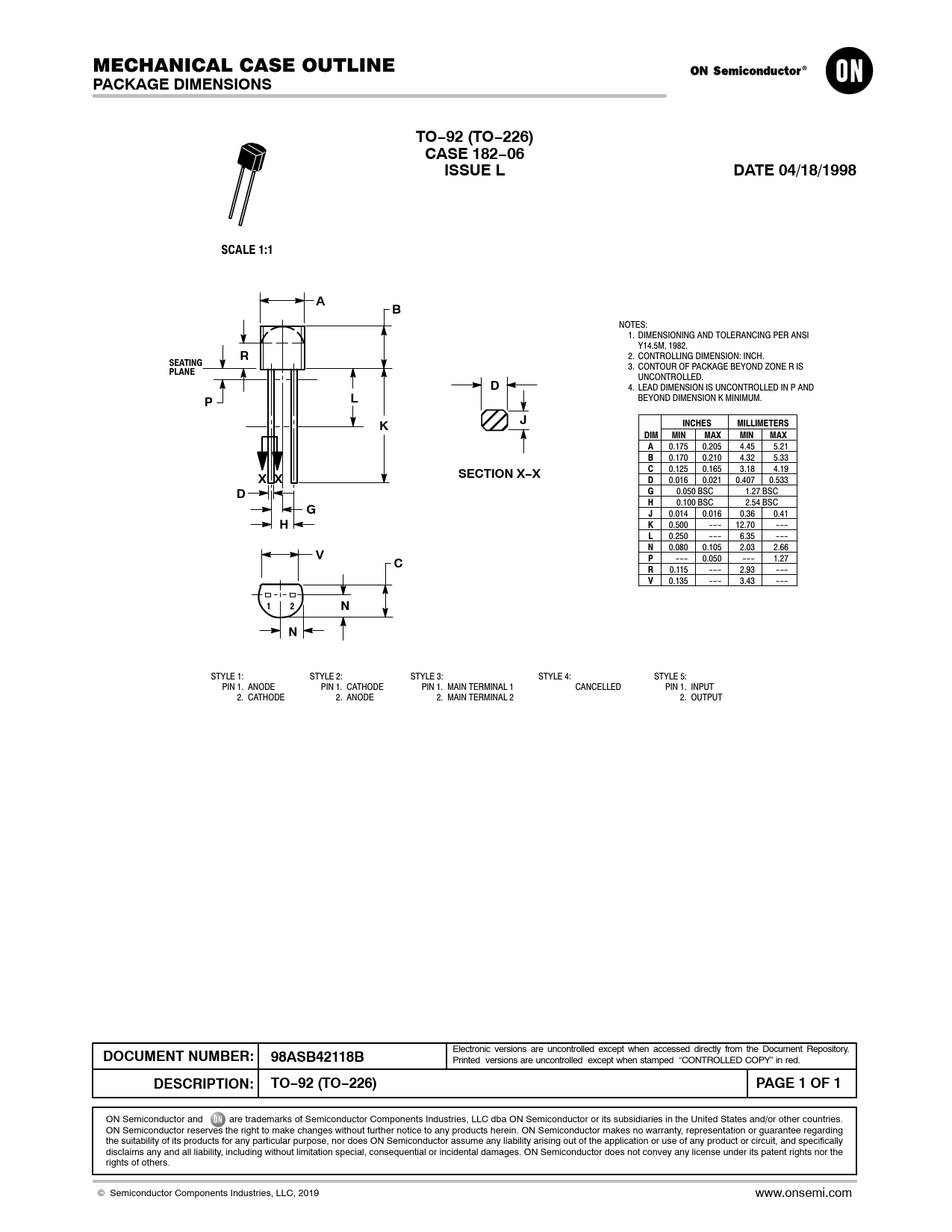 PACKAGE DIMENSIONS. TO−92 (TO−226). CASE 182−06. ISSUE L. DATE 04/18/1998. SCALE 1:1. SEATING. PLANE. INCHES. MILLIMETERS. DIM. MIN. MAX. X X