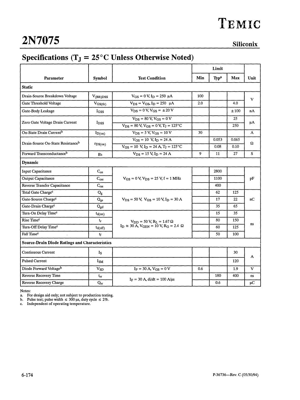 TEMIC. 2N7075 Siliconix Specifications (TJ -25°C Unless Otherwise Noted). Limit