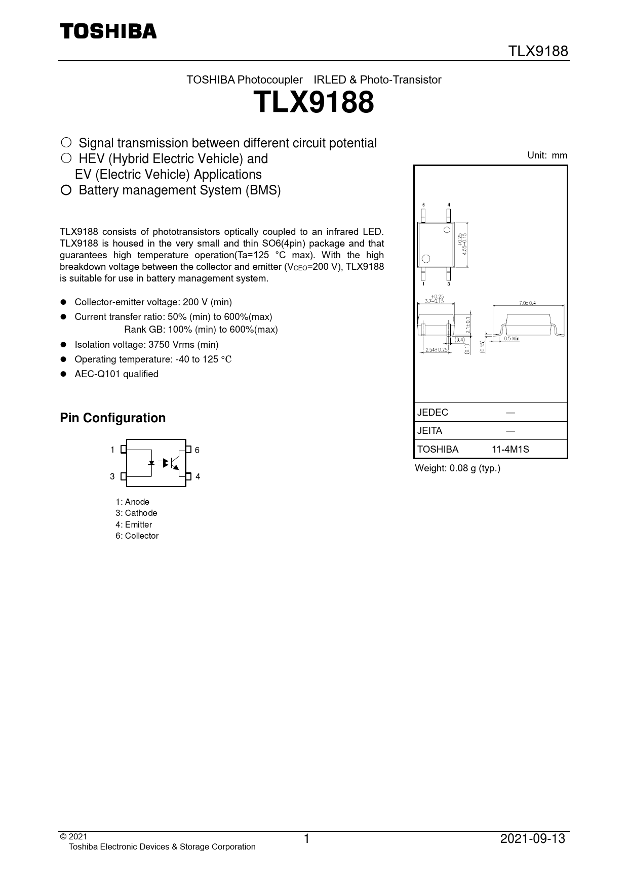 ― JEITA ― 1 6 TOSHIBA 11-4M1S Weight: 0.08 g (typ.) 3 4 4 4 1: Anode 3: Cathode 4: Emitter 6: Collector © 2 021 1 2021-09-13 Toshiba Electronic Devices & Storage Corporation