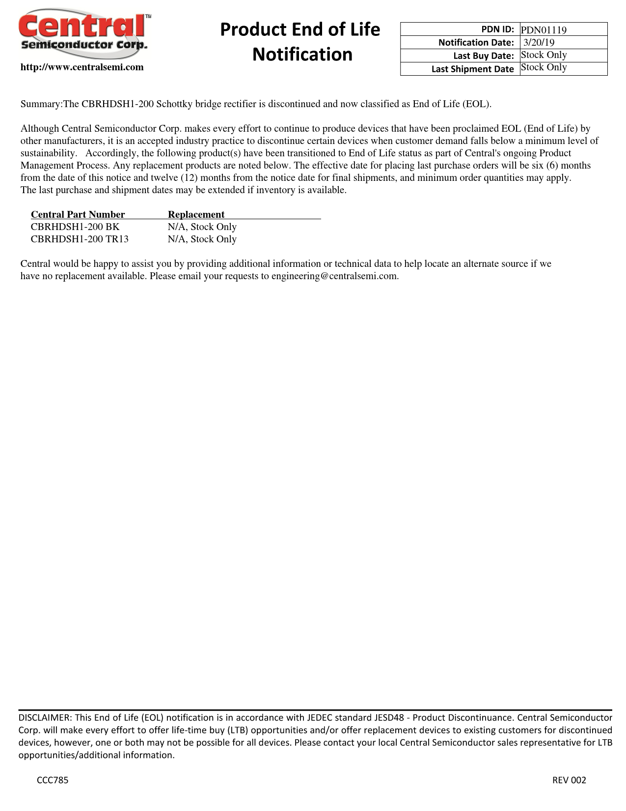 Stock Only Summary:The CBRHDSH1-200 Schottky bridge rectifier is discontinued and now classified as End of Life (EOL). Although Central Semiconductor Corp. makes every effort to continue to produce devices that have been proclaimed EOL (End of Life) by other manufacturers, it is an accepted industry practice to discontinue certain devices when customer demand falls below a minimum level of sustainability. Accordingly, the following product(s) have been transitioned to End of Life status as part of Central's ongoing Product Management Process. Any replacement products are noted below. The effective date for placing last purchase orders will be six (6) months from the date of this notice and twelve (12) months from the notice date for final shipments, and minimum order quantities may apply. The last purchase and shipment dates may be extended if inventory is available.