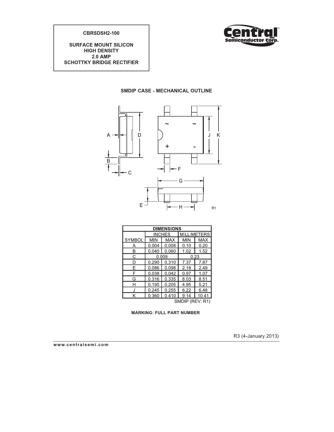 CBRSDSH2-100. SURFACE MOUNT SILICON. HIGH DENSITY. 2.0 AMP. SCHOTTKY BRIDGE RECTIFIER. SMDIP CASE - MECHANICAL OUTLINE