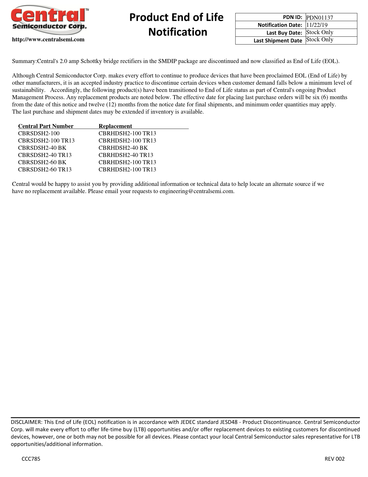 Stock Only Summary:Central's 2.0 amp Schottky bridge rectifiers in the SMDIP package are discontinued and now classified as End of Life (EOL). Although Central Semiconductor Corp. makes every effort to continue to produce devices that have been proclaimed EOL (End of Life) by other manufacturers, it is an accepted industry practice to discontinue certain devices when customer demand falls below a minimum level of sustainability. Accordingly, the following product(s) have been transitioned to End of Life status as part of Central's ongoing Product Management Process. Any replacement products are noted below. The effective date for placing last purchase orders will be six (6) months from the date of this notice and twelve (12) months from the notice date for final shipments, and minimum order quantities may apply. The last purchase and shipment dates may be extended if inventory is available.