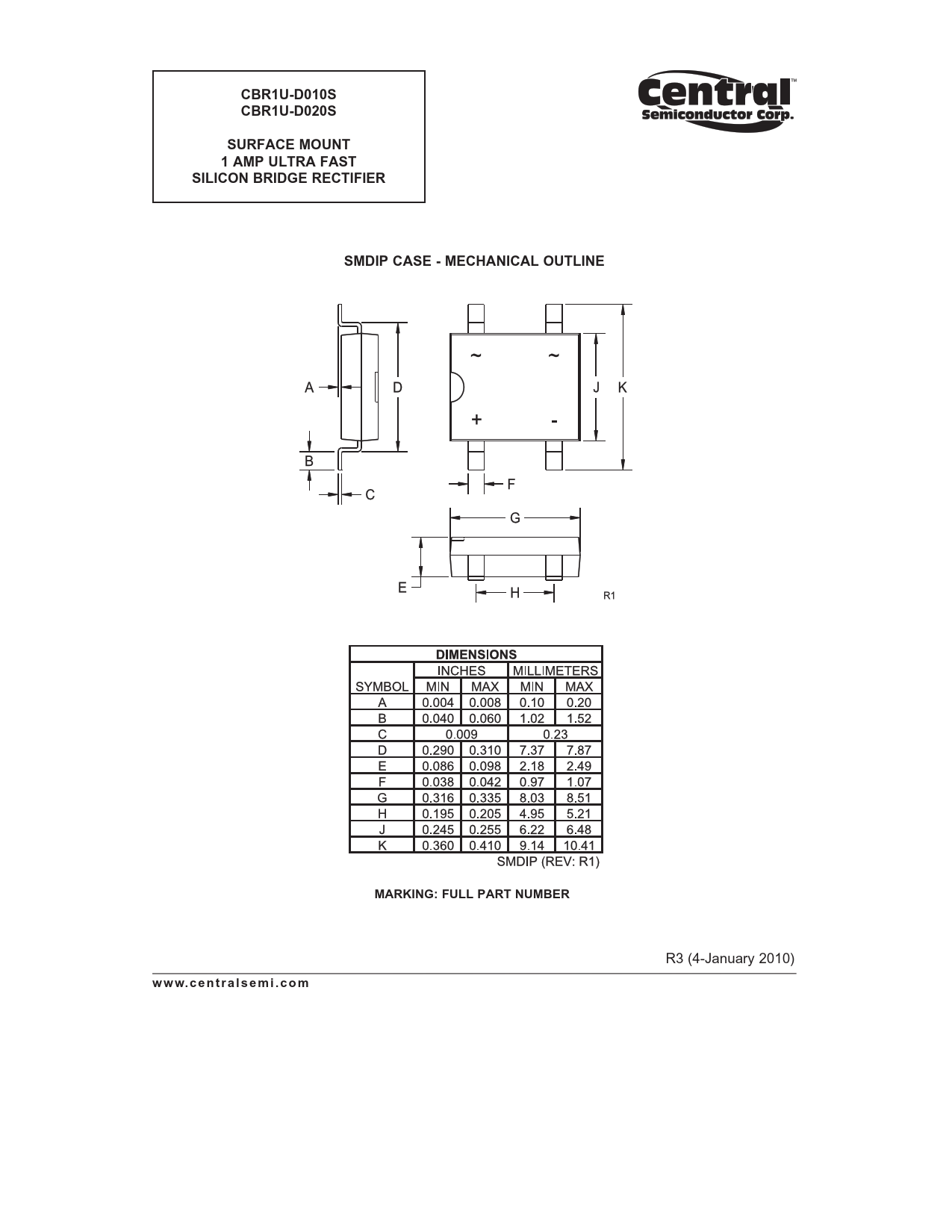 CBR1U-D010S. CBR1U-D020S. SURFACE MOUNT. 1 AMP ULTRA FAST. SILICON BRIDGE RECTIFIER. SMDIP CASE - MECHANICAL OUTLINE