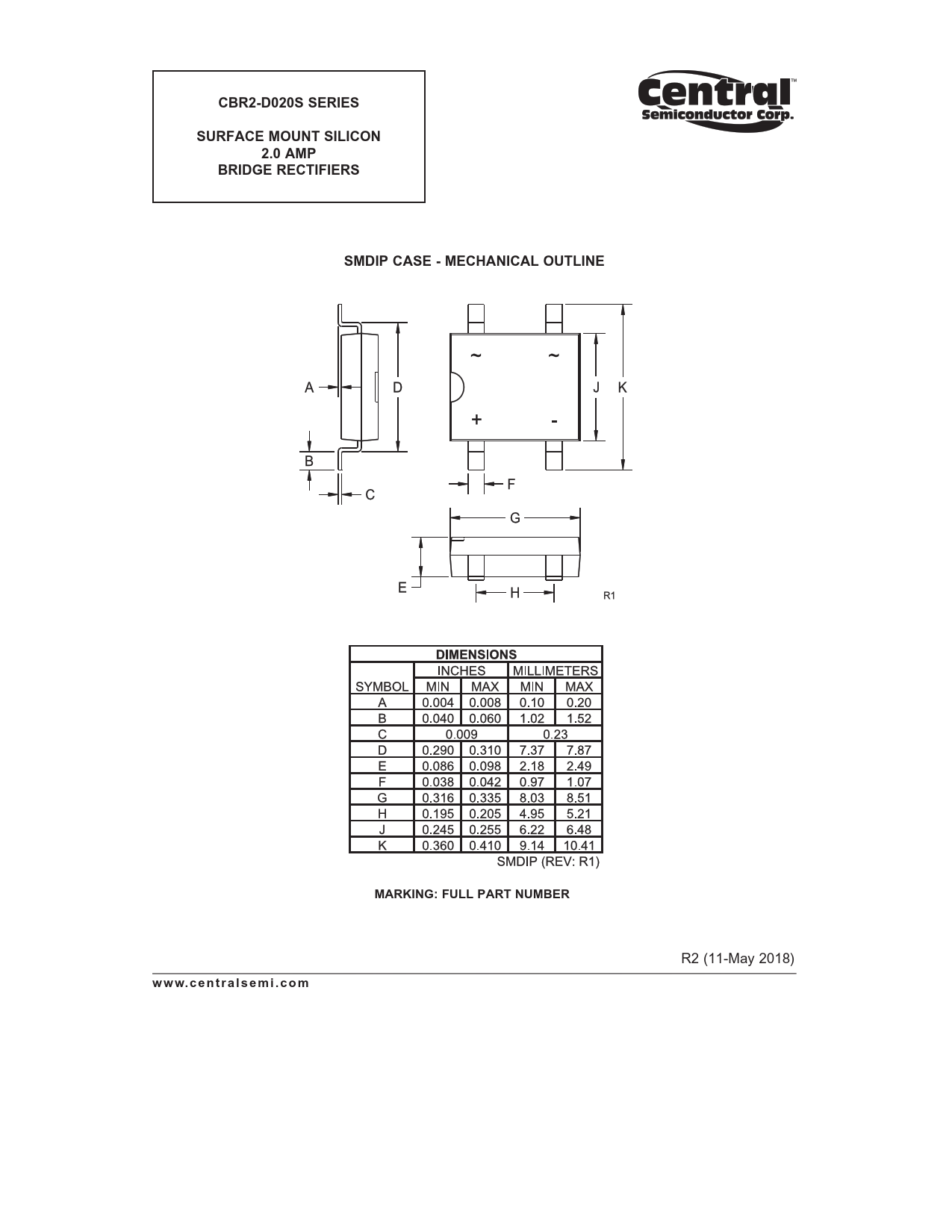 Modelllinie für dieses Datenblatt Textversion des Dokuments CBR2-D020S SERIES SURFACE MOUNT SILICON 2.0 AMP BRIDGE RECTIFIERS SMDIP CASE - MECHANICAL OUTLINE MARKING: FULL PART NUMBER R2 (11-May 2018)www.centralsemi.com