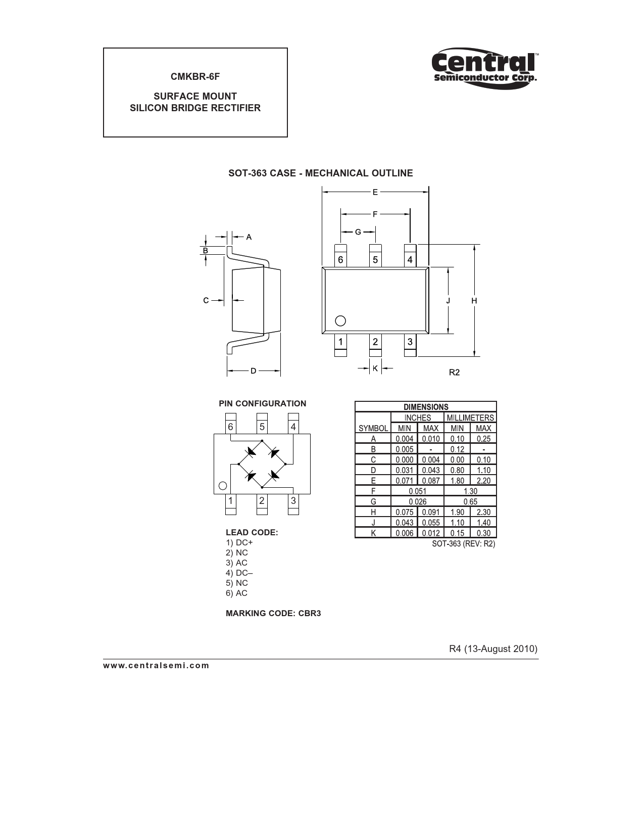 CMKBR-6F. SURFACE MOUNT. SILICON BRIDGE RECTIFIER. SOT-363 CASE - MECHANICAL OUTLINE. PIN CONFIGURATION. LEAD CODE: