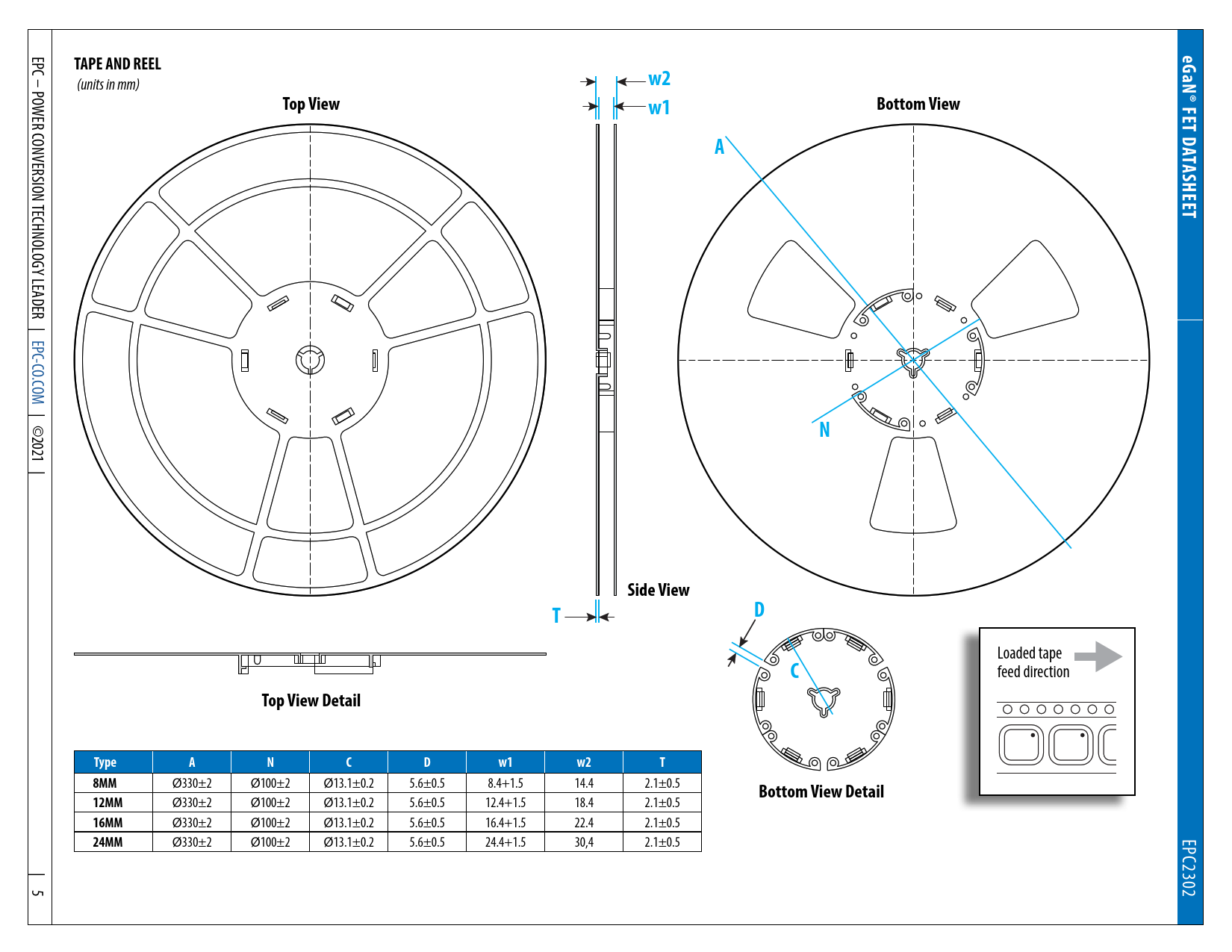 TAPE AND REEL. aN® FET D. Top View. Bottom View. ASHEET. Side View. Top View Detail. Type. 8MM. Bottom View Detail. 12MM. 16MM. 24MM