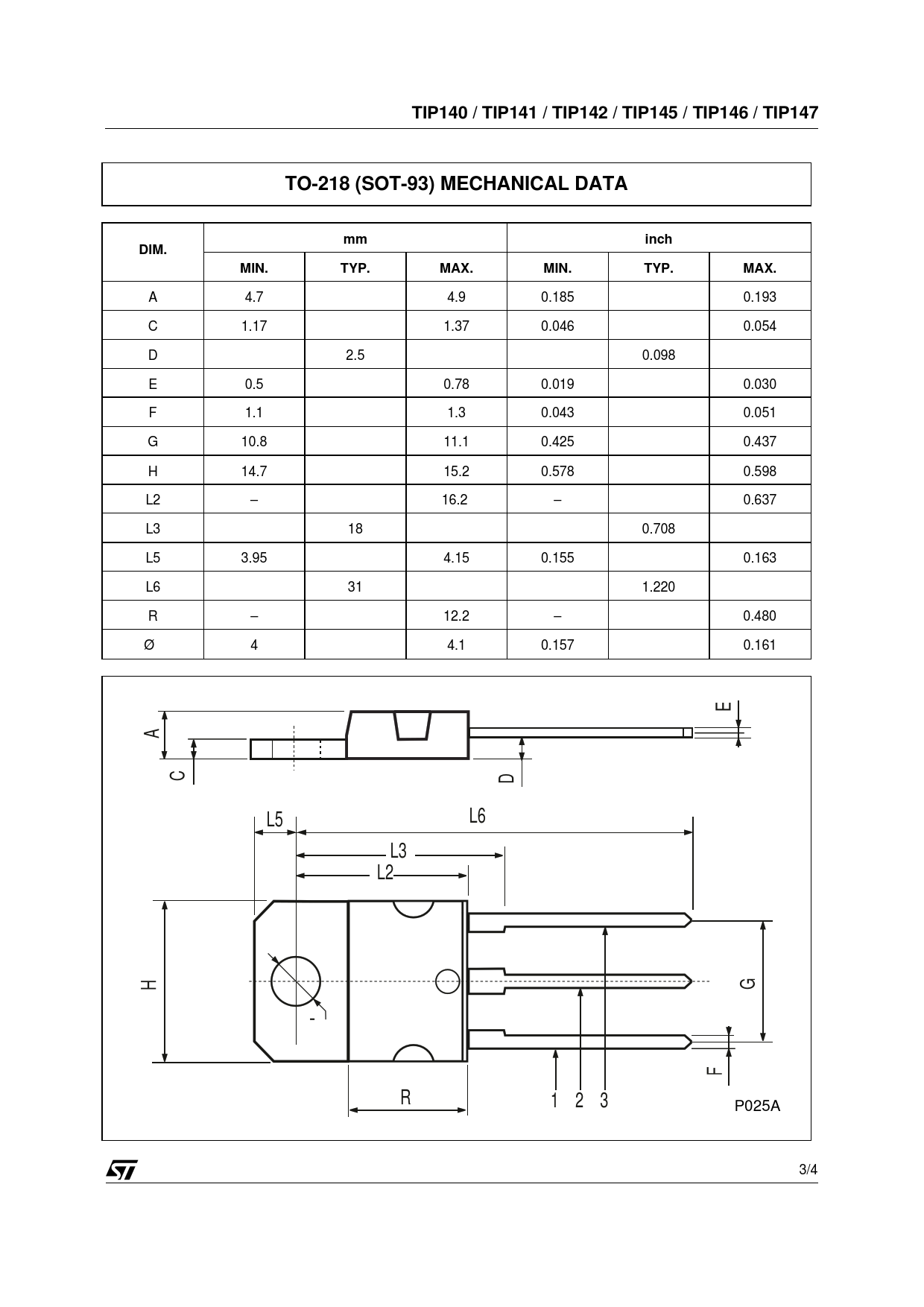 TIP140 / TIP141 / TIP142 / TIP145 / TIP146 / TIP147. TO-218 (SOT-93) MECHANICAL DATA. inch. DIM. MIN. TYP. MAX