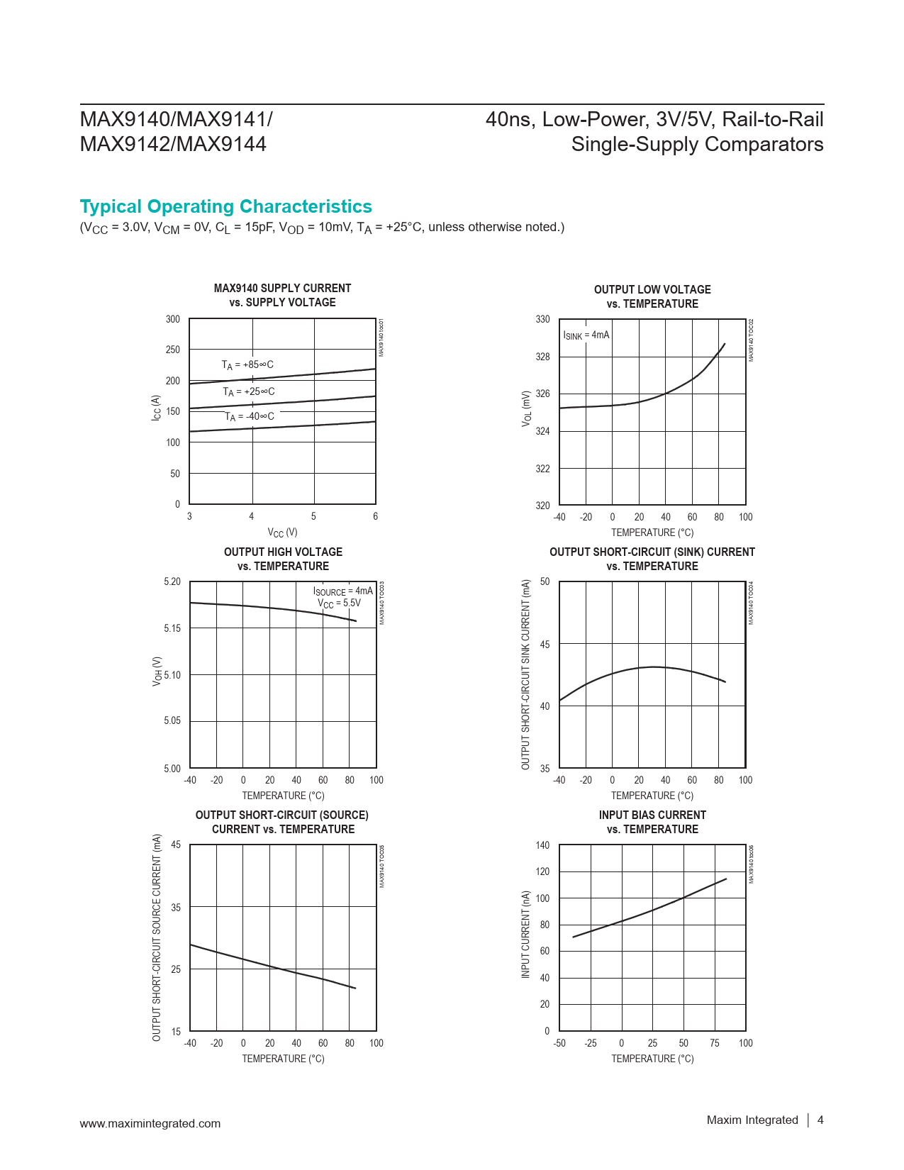 45 140 120 MAX9140 toc06 MAX9140 TOC05 100 35 80 60 25 INPUT CURRENT (nA) 40 20 15 0 OUTPUT SHORT-CIRCUIT SOURCE CURRENT (mA) -40 -20 0 20 40 60 80 100 -50 -25 0 25 50 75 100 TEMPERATURE (°C) TEMPERATURE (°C) www.maximintegrated.com Maxim Integrated │ 4