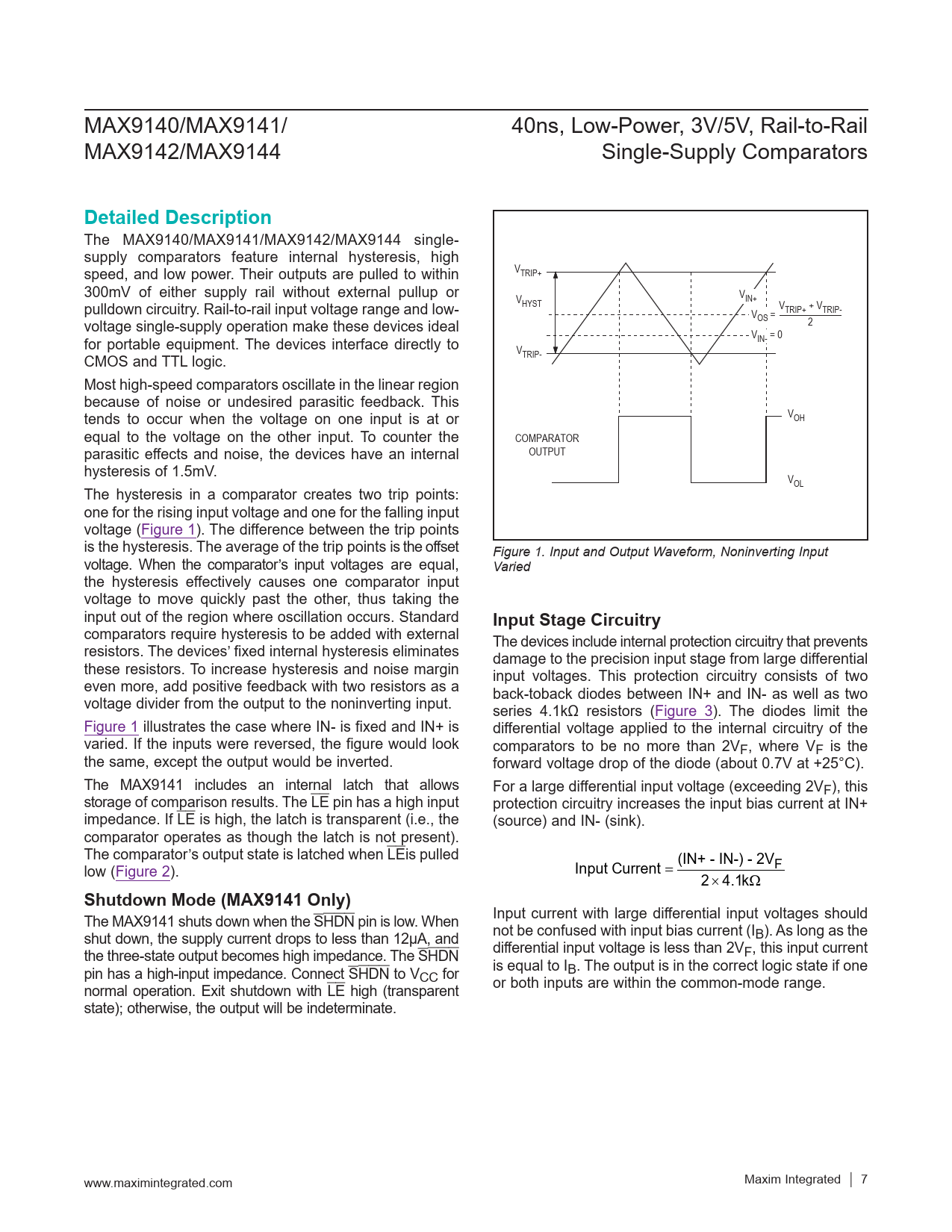 link to page 7 link to page 7 link to page 8 link to page 8 MAX9140/MAX9141/ 40ns, Low-Power, 3V/5V, Rail-to-Rail MAX9142/MAX9144 Single-Supply Comparators Detailed Description The MAX9140/MAX9141/MAX9142/MAX9144 single- supply comparators feature internal hysteresis, high speed, and low power. Their outputs are pulled to within VTRIP+ 300mV of either supply rail without external pullup or VIN+ pulldown circuitry. Rail-to-rail input voltage range and low- VHYST VTRIP+ + VTRIP- V voltage single-supply operation make these devices ideal OS = 2 for portable equipment. The devices interface directly to VIN- = 0 V CMOS and TTL logic. TRIP- Most high-speed comparators oscillate in the linear region because of noise or undesired parasitic feedback. This tends to occur when the voltage on one input is at or VOH equal to the voltage on the other input. To counter the COMPARATOR parasitic effects and noise, the devices have an internal OUTPUT hysteresis of 1.5mV. VOL The hysteresis in a comparator creates two trip points: one for the rising input voltage and one for the falling input voltage (Figure 1). The difference between the trip points is the hysteresis. The average of the trip points is the of set Figure 1. Input and Output Waveform, Noninverting Input voltage. When the comparator’s input voltages are equal, Varied the hysteresis effectively causes one comparator input voltage to move quickly past the other, thus taking the input out of the region where oscillation occurs. Standard Input Stage Circuitry comparators require hysteresis to be added with external The devices include internal protection circuitry that prevents resistors. The devices’ fixed internal hysteresis eliminates damage to the precision input stage from large differential these resistors. To increase hysteresis and noise margin input voltages. This protection circuitry consists of two even more, add positive feedback with two resistors as a back-toback diodes between IN+ and IN- as well as two voltage divider from the output to the noninverting input. series 4.1kΩ resistors (Figure 3). The diodes limit the Figure 1 illustrates the case where IN- is fixed and IN+ is differential voltage applied to the internal circuitry of the varied. If the inputs were reversed, the figure would look comparators to be no more than 2VF, where VF is the the same, except the output would be inverted. forward voltage drop of the diode (about 0.7V at +25°C). The MAX9141 includes an internal latch that allows For a large differential input voltage (exceeding 2VF), this storage of comparison results. The LE pin has a high input protection circuitry increases the input bias current at IN+ impedance. If LE is high, the latch is transparent (i.e., the (source) and IN- (sink). comparator operates as though the latch is not present). The comparator’s output state is latched when LEis pulled (IN+ - IN-) - 2V low (Figure 2). F Input Current = 2 × 4.1kΩ Shutdown Mode (MAX9141 Only) The MAX9141 shuts down when the SHDN pin is low. When Input current with large differential input voltages should shut down, the supply current drops to less than 12μA, and not be confused with input bias current (IB). As long as the the three-state output becomes high impedance. The SHDN differential input voltage is less than 2VF, this input current pin has a high-input impedance. Connect SHDN to V is equal to I CC for B. The output is in the correct logic state if one normal operation. Exit shutdown with LE high (transparent or both inputs are within the common-mode range. state); otherwise, the output will be indeterminate. www.maximintegrated.com Maxim Integrated │ 7