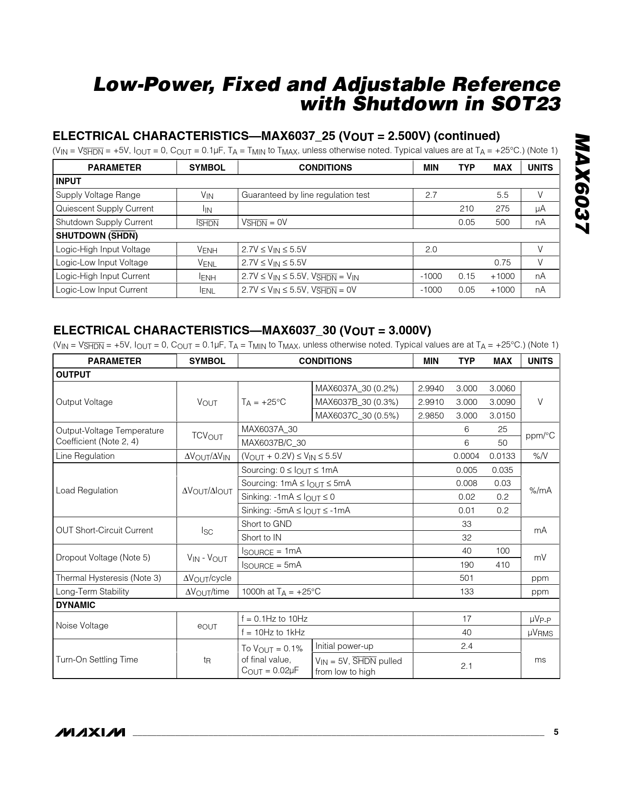 Low-Power, Fixed and Adjustable Reference with Shutdown in SOT23 MAX6037 ELECTRICAL CHARACTERISTICS—MAX6037_25 (VOUT = 2.500V) (continued)