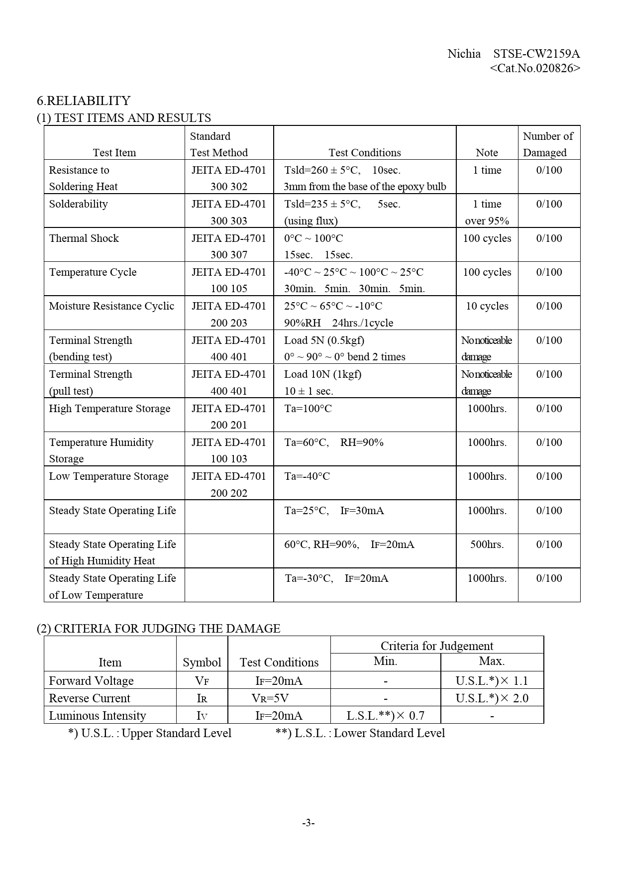 Nichia STSE-CW2159A 6.RELIABILITY. (1) TEST ITEMS AND RESULTS. Test Item Standard. Test Method Test Conditions Note Number of