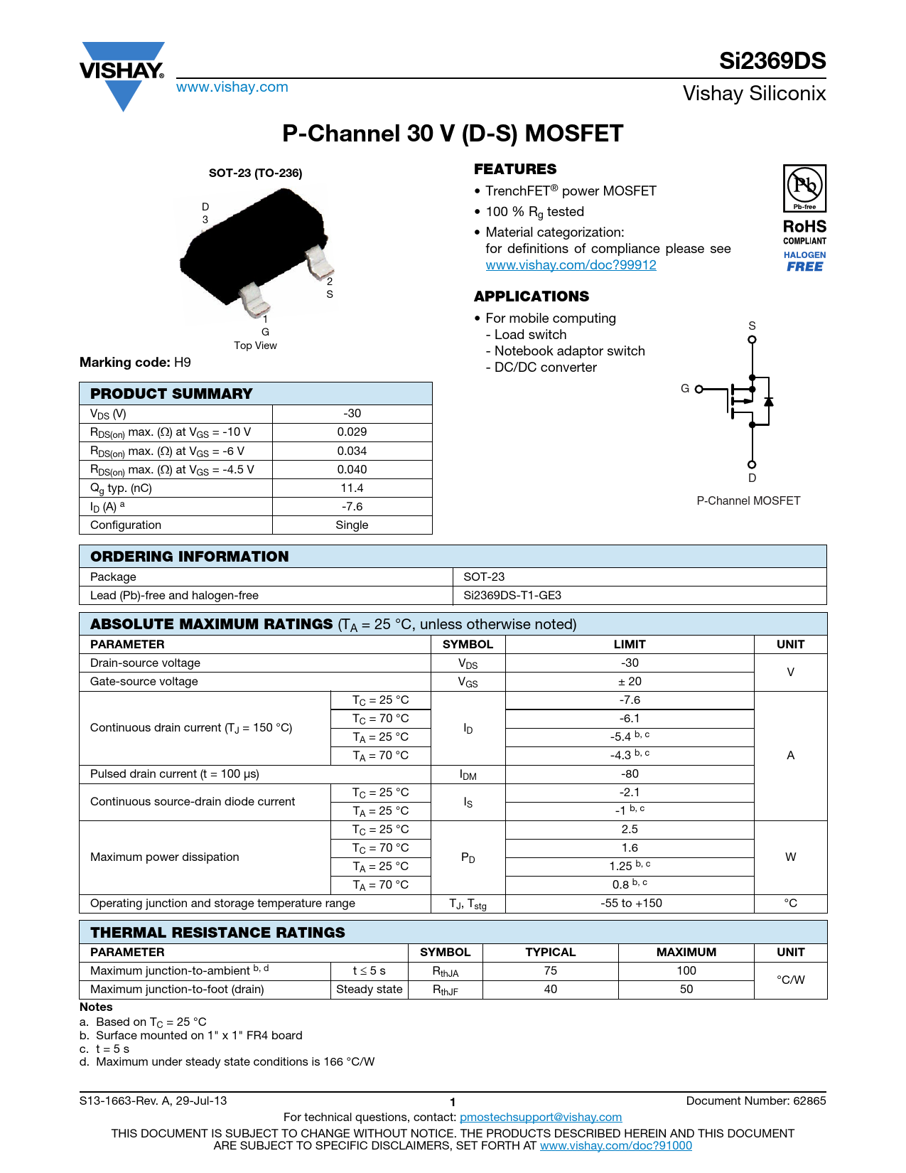 Si2369DS. P-Channel 30 V (D-S) MOSFET. FEATURES. SOT-23 (TO-236). APPLICATIONS. Marking code:. PRODUCT SUMMARY. ORDERING INFORMATION