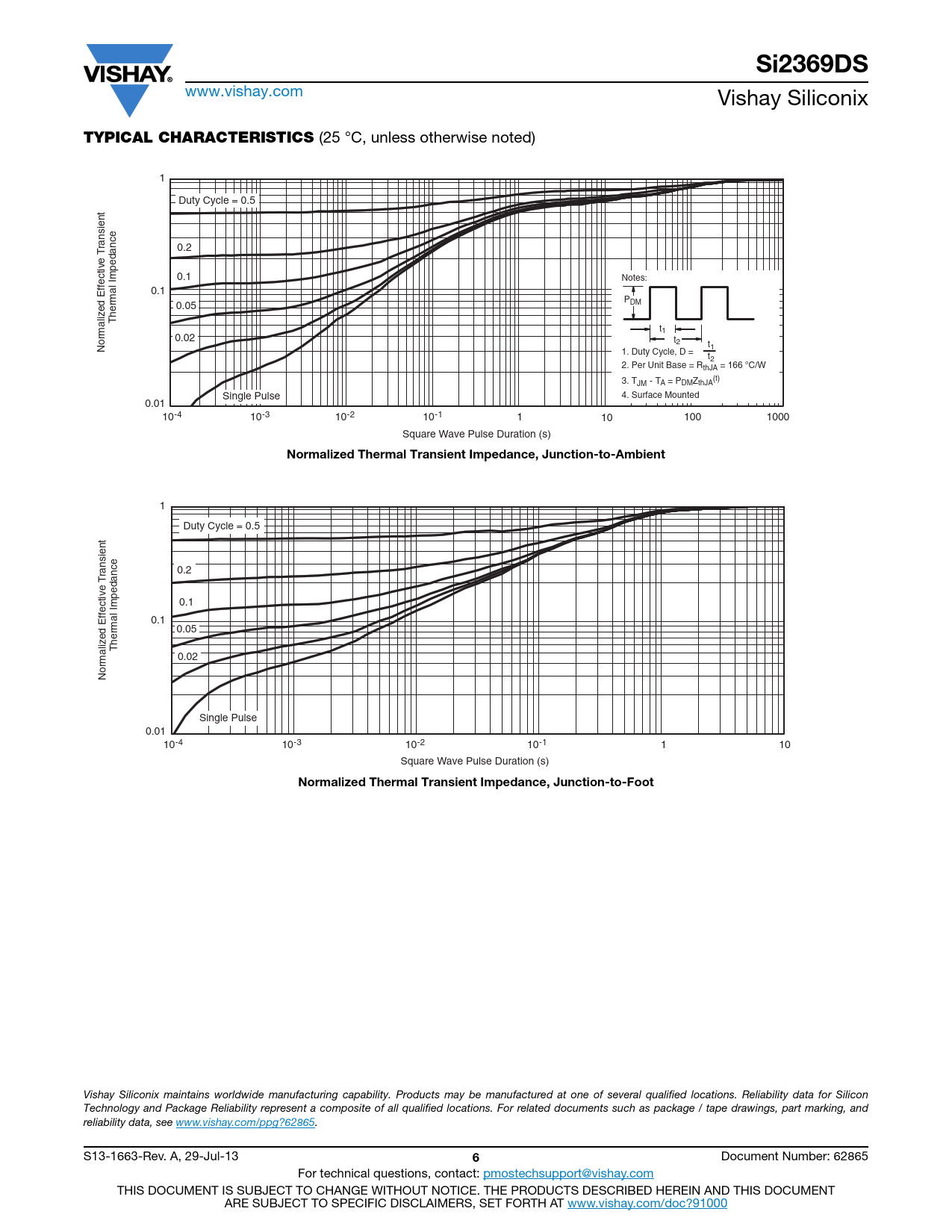 (25 °C, unless otherwise noted) 1 Duty Cycle = 0.5 ransient 0.2 T 0.1 Impedance Notes: fective Ef 0.1 PDM 0.05 Thermal t1 0.02 t2 Normalized t1 1. Duty Cycle, D = t2 2. Per Unit Base = RthJA = 166 °C/W 3. T (t) JM - TA = PDMZthJA 4. Surface Mounted Single Pulse 0.01 10-3 10-2 10-1 10-4 1 10 100 1000 Square Wave Pulse Duration (s)
