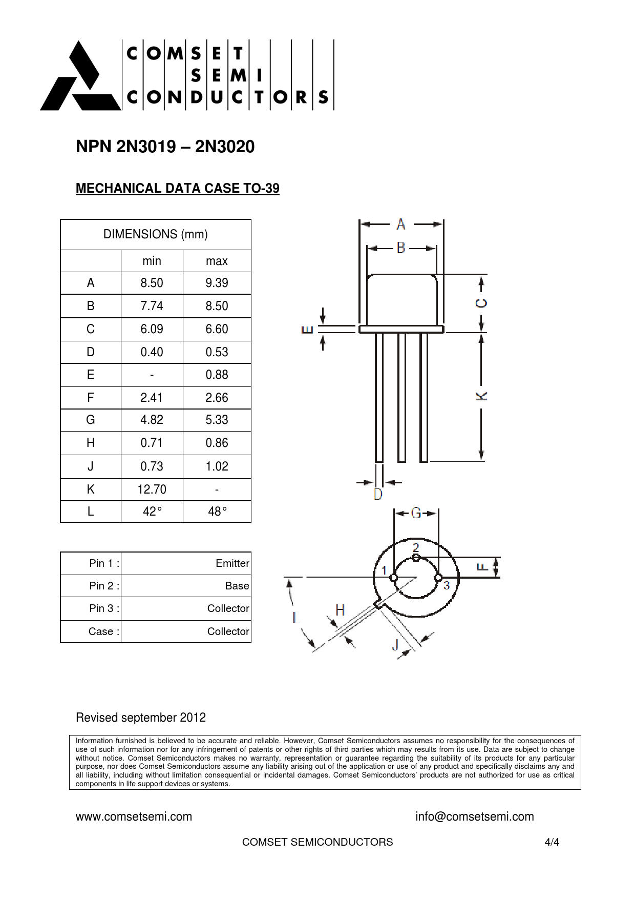 NPN 2N3019 – 2N3020 MECHANICAL DATA CASE TO-39 DIMENSIONS (mm) min max A 8.50 9.39 B 7.74 8.50 C 6.09 6.60 D 0.40 0.53 E -0.88 F 2.41 2.66 G 4.82 5.33 H 0.71 0.86 J 0.73 1.02 K 12.70 -L 42° 48° Pin 1 : Emitter Pin 2 : Base Pin 3 : Collector Case : Collector Revised september 2012