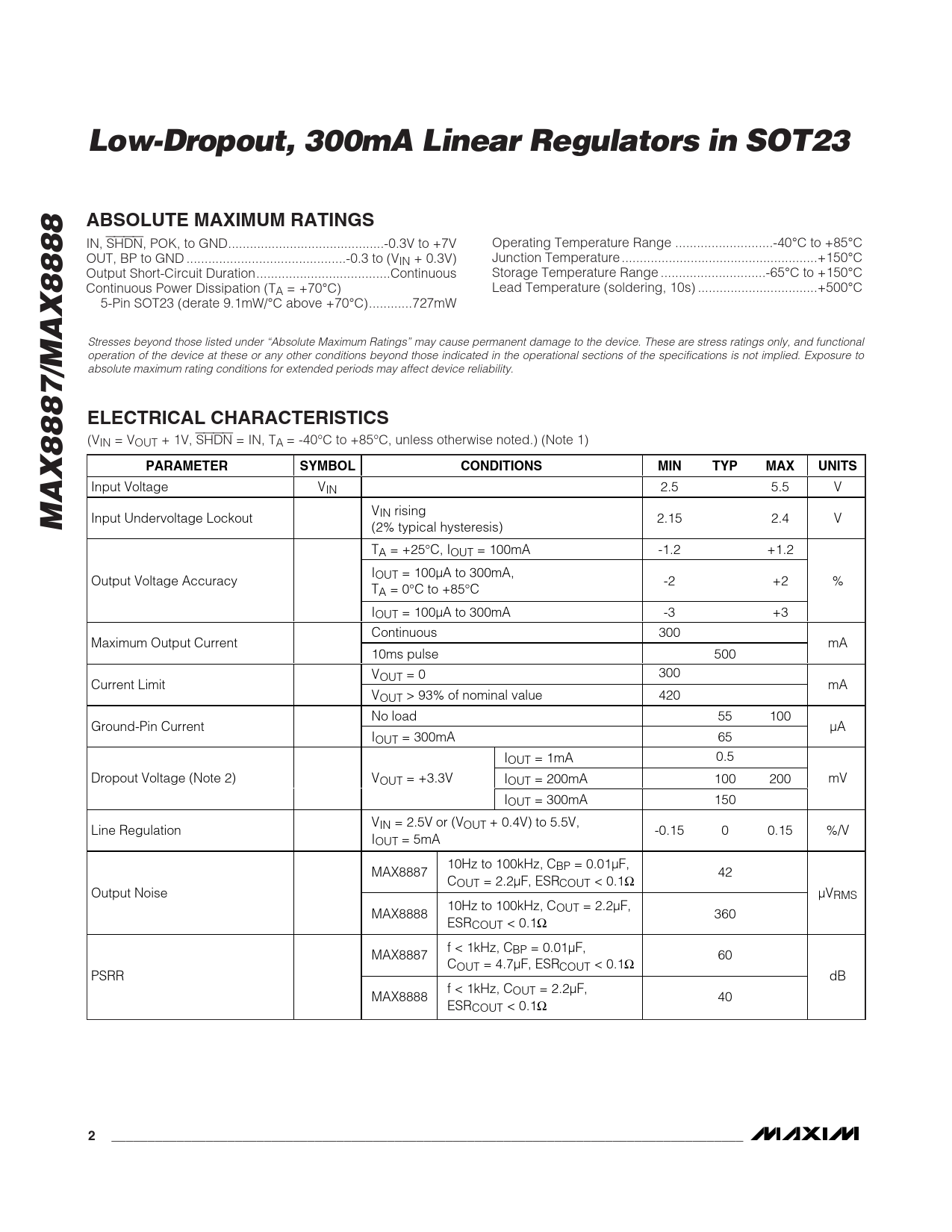 Low-Dropout, 300mA Linear Regulators in SOT23ABSOLUTE MAXIMUM RATINGS IN, SHDN, POK, to GND...-0.3V to +7V Operating Temperature Range ...-40°C to +85°C OUT, BP to GND ..-0.3 to (VIN + 0.3V) Junction Temperature ..+150°C Output Short-Circuit Duration...Continuous Storage Temperature Range ...-65°C to +150°C Continuous Power Dissipation (TA = +70°C) Lead Temperature (soldering, 10s) ...+500°C 5-Pin SOT23 (derate 9.1mW/°C above +70°C)..727mW Stresses beyond those listed under “Absolute Maximum Ratings” may cause permanent damage to the device. These are stress ratings only, and functional operation of the device at these or any other conditions beyond those indicated in the operational sections of the specifications is not implied. Exposure to absolute maximum rating conditions for extended periods may affect device reliability. ELECTRICAL CHARACTERISTICS (VIN = VOUT + 1V, SHDN = IN, TA = -40°C to +85°C, unless otherwise noted.) (Note 1) PARAMETERSYMBOLCONDITIONSMINTYPMAXUNITS Input Voltage VIN 2.5 5.5 V MAX8887/MAX8888 V Input Undervoltage Lockout IN rising 2.15 2.4 V (2% typical hysteresis) TA = +25°C, IOUT = 100mA -1.2 +1.2 IOUT = 100µA to 300mA, Output Voltage Accuracy -2 +2 % TA = 0°C to +85°C IOUT = 100µA to 300mA -3 +3 Continuous 300 Maximum Output Current mA 10ms pulse 500 VOUT = 0 300 Current Limit mA VOUT > 93% of nominal value 420 No load 55 100 Ground-Pin Current µA IOUT = 300mA 65 IOUT = 1mA 0.5 Dropout Voltage (Note 2) VOUT = +3.3V IOUT = 200mA 100 200 mV IOUT = 300mA 150 V Line Regulation IN = 2.5V or (VOUT + 0.4V) to 5.5V, -0.15 0 0.15 %/V IOUT = 5mA 10Hz to 100kHz, C MAX8887 BP = 0.01µF, COUT = 2.2µF, ESRCOUT < 0.1Ω 42 Output Noise µVRMS 10Hz to 100kHz, C MAX8888 OUT = 2.2µF, ESRCOUT < 0.1Ω 360 f < 1kHz, C MAX8887 BP = 0.01µF, COUT = 4.7µF, ESRCOUT < 0.1Ω 60 PSRR dB f < 1kHz, COUT = 2.2µF, MAX8888 ESRCOUT < 0.1Ω 40 2_______________________________________________________________________________________