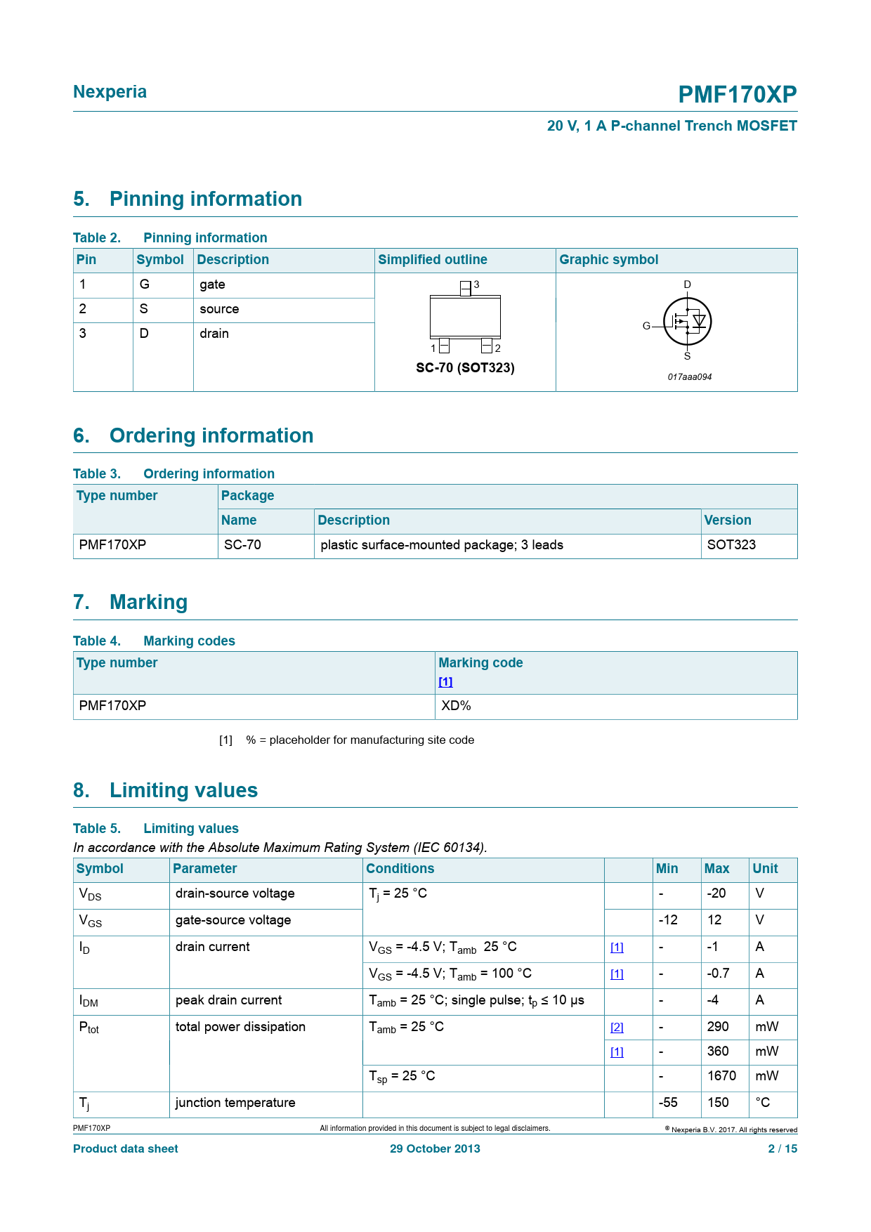| Seiten / Seite | 15 / 2 — Nexperia. PMF170XP. 20 V, 1 A P-channel Trench MOSFET. 5. Pinning … |