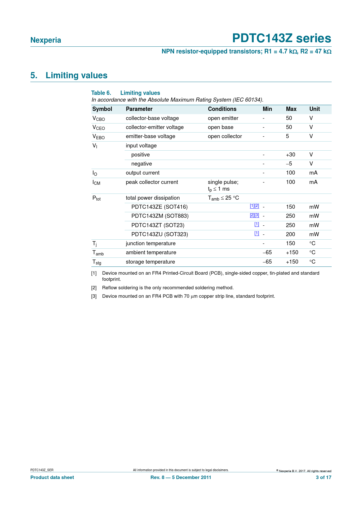 Nexperia PDTC143Z series NPN resistor-equipped transistors; R1 = 4.7 k , R2 = 47 k 5. Limiting values Table 6. Limiting values