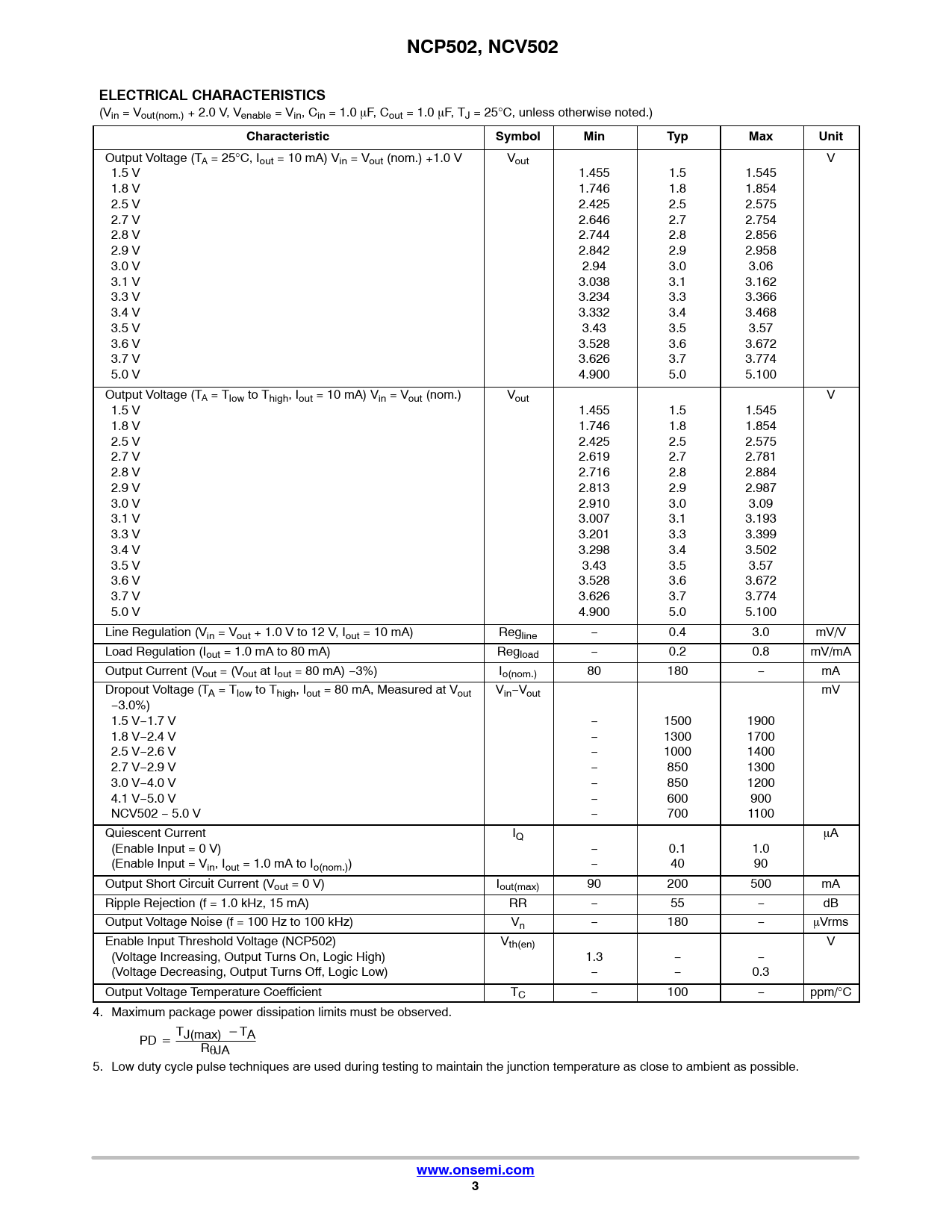 Output Voltage (TA = 25°C, Iout = 10 mA) Vin = Vout (nom.) +1.0 V Vout V 1.5 V 1.455 1.5 1.545 1.8 V 1.746 1.8 1.854 2.5 V 2.425 2.5 2.575 2.7 V 2.646 2.7 2.754 2.8 V 2.744 2.8 2.856 2.9 V 2.842 2.9 2.958 3.0 V 2.94 3.0 3.06 3.1 V 3.038 3.1 3.162 3.3 V 3.234 3.3 3.366 3.4 V 3.332 3.4 3.468 3.5 V 3.43 3.5 3.57 3.6 V 3.528 3.6 3.672 3.7 V 3.626 3.7 3.774 5.0 V 4.900 5.0 5.100 Output Voltage (TA = Tlow to Thigh, Iout = 10 mA) Vin = Vout (nom.) Vout V 1.5 V 1.455 1.5 1.545 1.8 V 1.746 1.8 1.854 2.5 V 2.425 2.5 2.575 2.7 V 2.619 2.7 2.781 2.8 V 2.716 2.8 2.884 2.9 V 2.813 2.9 2.987 3.0 V 2.910 3.0 3.09 3.1 V 3.007 3.1 3.193 3.3 V 3.201 3.3 3.399 3.4 V 3.298 3.4 3.502 3.5 V 3.43 3.5 3.57 3.6 V 3.528 3.6 3.672 3.7 V 3.626 3.7 3.774 5.0 V 4.900 5.0 5.100 Line Regulation (Vin = Vout + 1.0 V to 12 V, Iout = 10 mA) Regline − 0.4 3.0 mV/V Load Regulation (Iout = 1.0 mA to 80 mA) Regload − 0.2 0.8 mV/mA Output Current (Vout = (Vout at Iout = 80 mA) −3%) Io(nom.) 80 180 − mA Dropout Voltage (TA = Tlow to Thigh, Iout = 80 mA, Measured at Vout Vin−Vout mV −3.0%) 1.5 V−1.7 V − 1500 1900 1.8 V−2.4 V − 1300 1700 2.5 V−2.6 V − 1000 1400 2.7 V−2.9 V − 850 1300 3.0 V−4.0 V − 850 1200 4.1 V−5.0 V − 600 900 NCV502 − 5.0 V − 700 1100 Quiescent Current IQ A (Enable Input = 0 V) − 0.1 1.0 (Enable Input = Vin, Iout = 1.0 mA to Io(nom.)) − 40 90 Output Short Circuit Current (Vout = 0 V) Iout(max) 90 200 500 mA Ripple Rejection (f = 1.0 kHz, 15 mA) RR − 55 − dB Output Voltage Noise (f = 100 Hz to 100 kHz) Vn − 180 − Vrms Enable Input Threshold Voltage (NCP502) Vth(en) V (Voltage Increasing, Output Turns On, Logic High) 1.3 − − (Voltage Decreasing, Output Turns Off, Logic Low) − − 0.3 Output Voltage Temperature Coefficient TC − 100 − ppm/°C 4. Maximum package power dissipation limits must be observed. T PD + J(max) *TA RJA 5. Low duty cycle pulse techniques are used during testing to maintain the junction temperature as close to ambient as possible.