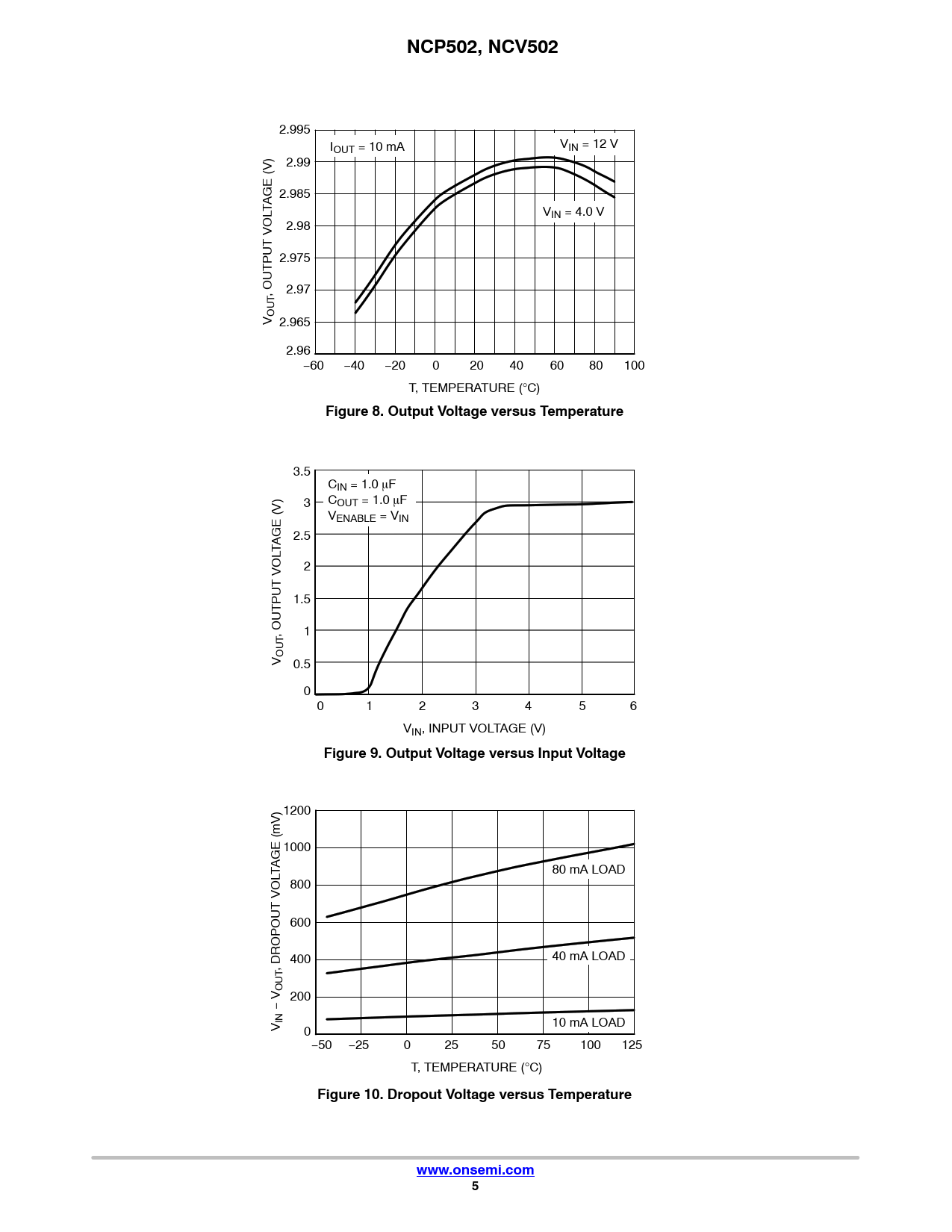 NCP502, NCV502 2.995 I VIN = 12 V OUT = 10 mA 2.99 2.985 TAGE (V) VIN = 4.0 V 2.98 2.975 , OUTPUT VOL 2.97 V OUT 2.965 2.96 −60 −40 −20 0 20 40 60 80 100 T, TEMPERATURE (°C) Figure 8. Output Voltage versus Temperature 3.5 CIN = 1.0 F 3 COUT = 1.0 F VENABLE = VIN 2.5 TAGE (V) 2 1.5 , OUTPUT VOL 1 V OUT 0.5 0 0 1 2 3 4 5 6 VIN, INPUT VOLTAGE (V) Figure 9. Output Voltage versus Input Voltage 1200 1000 TAGE (mV) 80 mA LOAD 800 600 400 40 mA LOAD , DROPOUT VOL OUT 200 − V V IN 10 mA LOAD 0−50 −25 0 25 50 75 100 125 T, TEMPERATURE (°C) Figure 10. Dropout Voltage versus Temperaturewww.onsemi.com5